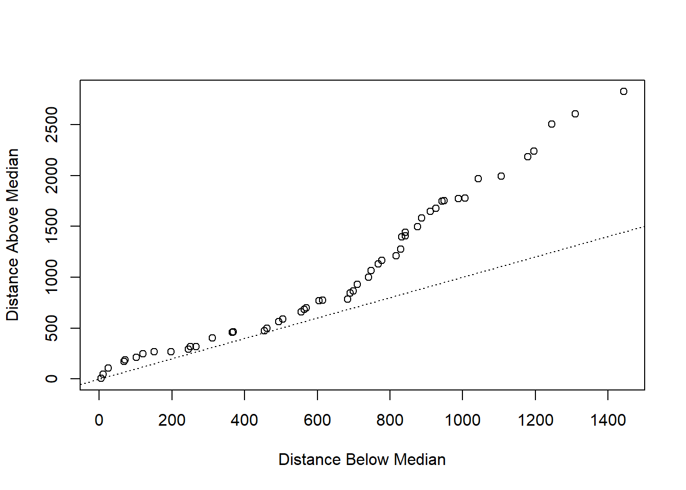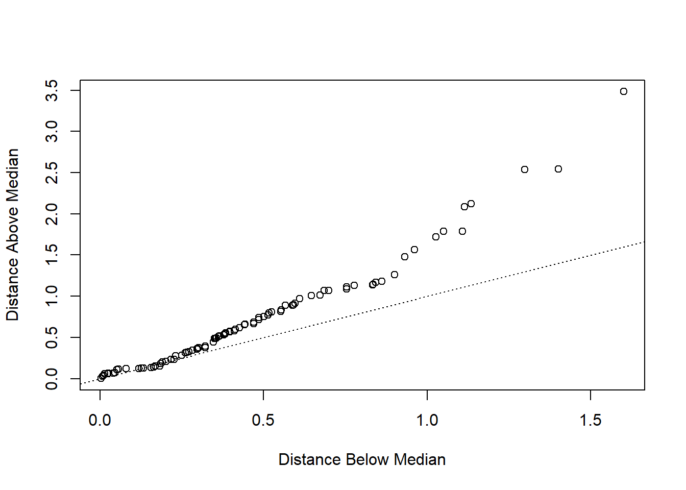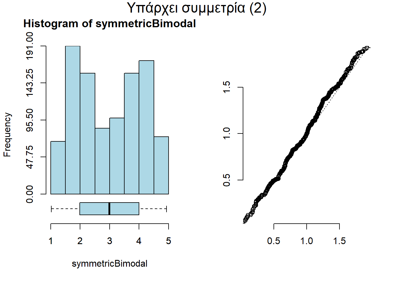 Το γράφημα ασυμμετρίας μοιάζει πολύ με το γράφημα Q-Q, που θα δούμε πιο μετά, αλλά δεν είναι το ίδιο. Αυτό είναι εξειδικευμένο στο να ανιχνεύει τη συμμετρία, ενώ το Q-Q στο να ανιχνεύει αποκλίσεις από την κανονική ή άλλες κατανομές. Πάντως, και σ’ αυτή την περίπτωση, το «κλειδί» είναι να είναι το γράφημα σχεδόν ευθεία γραμμή. Άπαξ και είναι ευθεία γραμμή, τα δεδομένα μας είναι συμμετρικά.