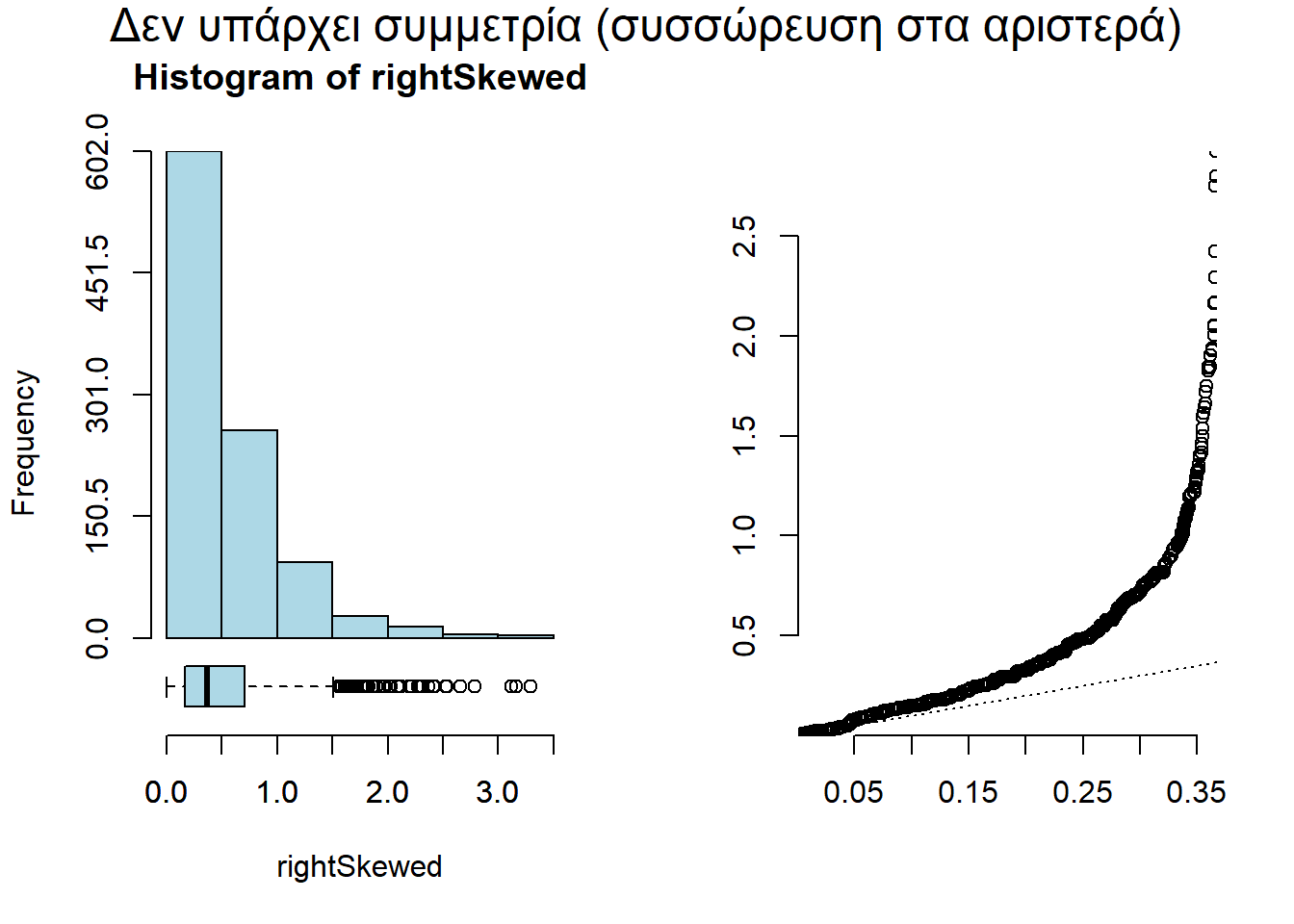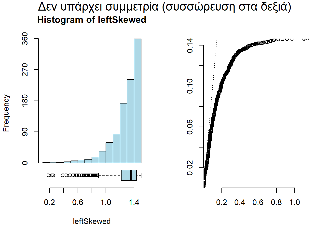 – Θετικός συντελεστής ασυμμετρίας του Pearson σημαίνει ότι οι περισσότερες τιμές θα είναι μαζεμένες στα αριστερά και θα υπάρχει μια «ουρά» από σπάνιες τιμές στα δεξιά.
