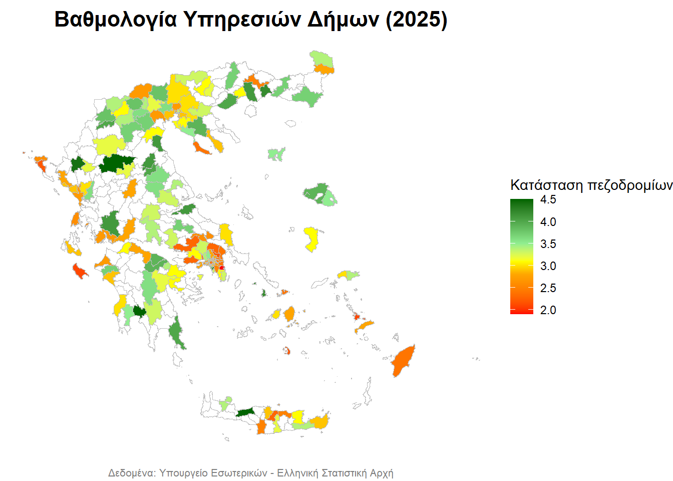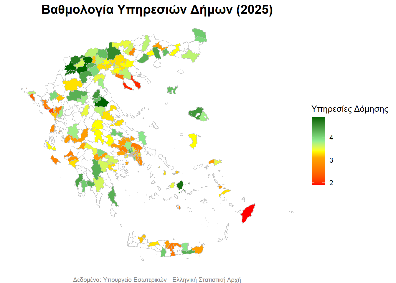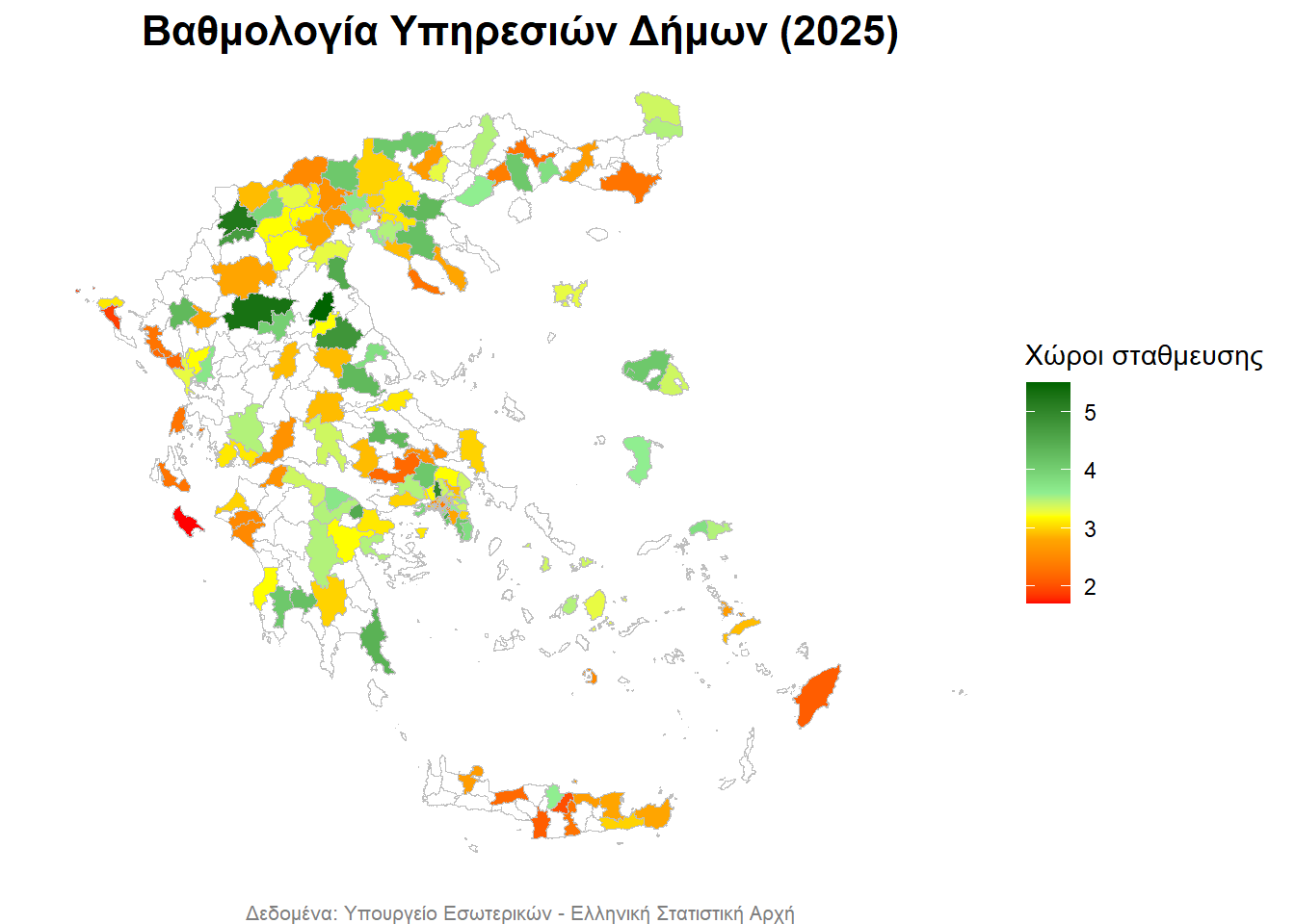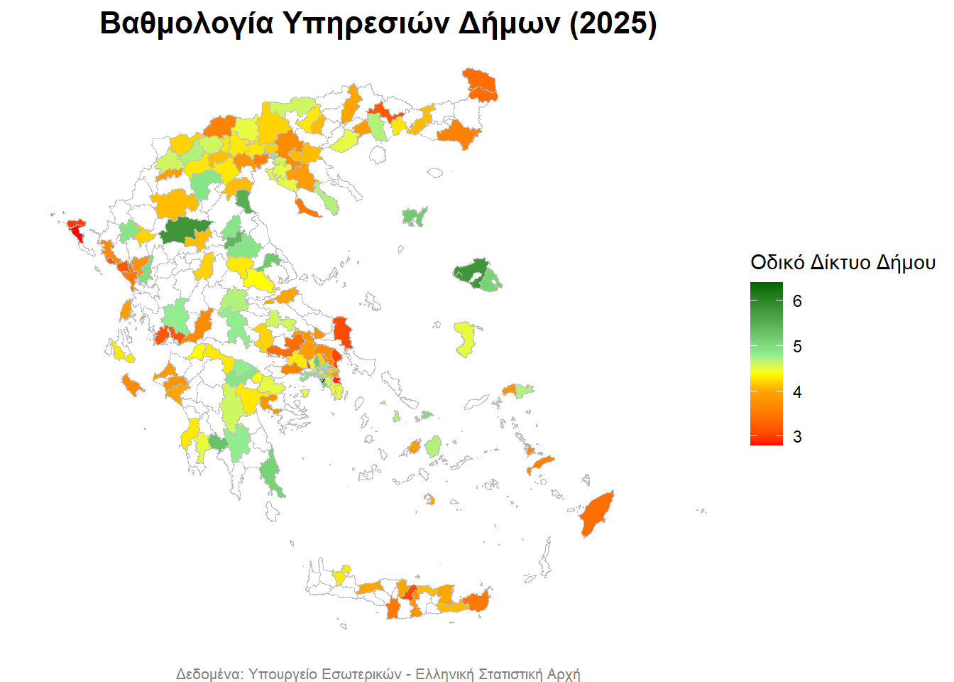 Για την κατασκευή των χαρτών αντλήθηκαν δεδομένα από τα Ψηφιακά Χαρτογραφικά Υπόβαθρα. Ο χρωματισμός των περιοχών έγινε με βάση τη μέση τιμή αξιολόγησης που πέτυχε ο κάθε Δήμος. Συγκεκριμένα: