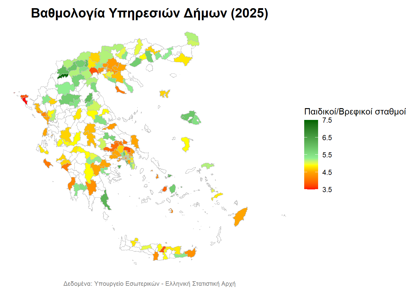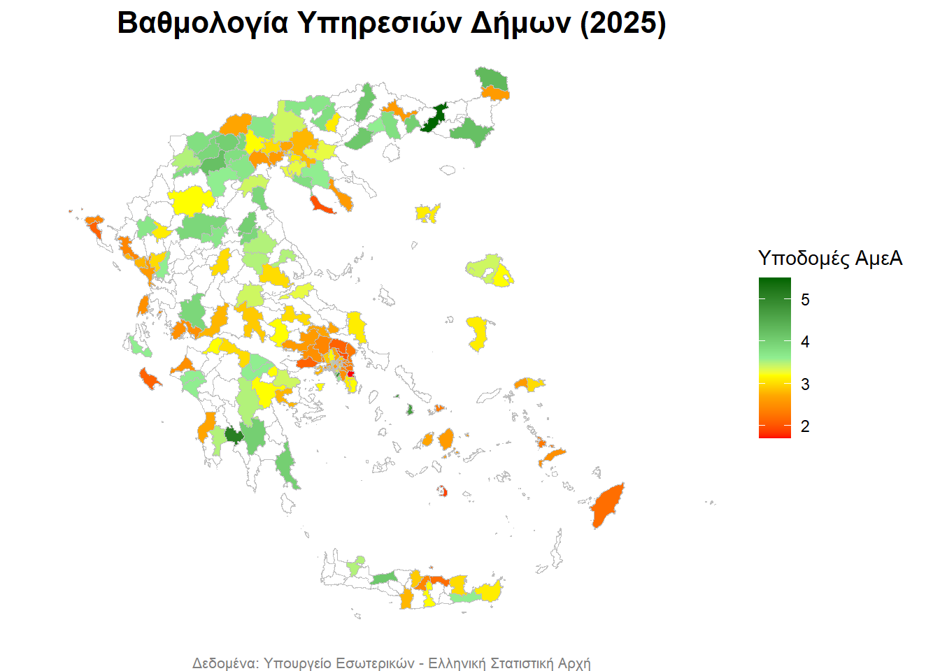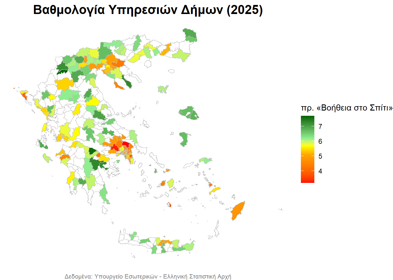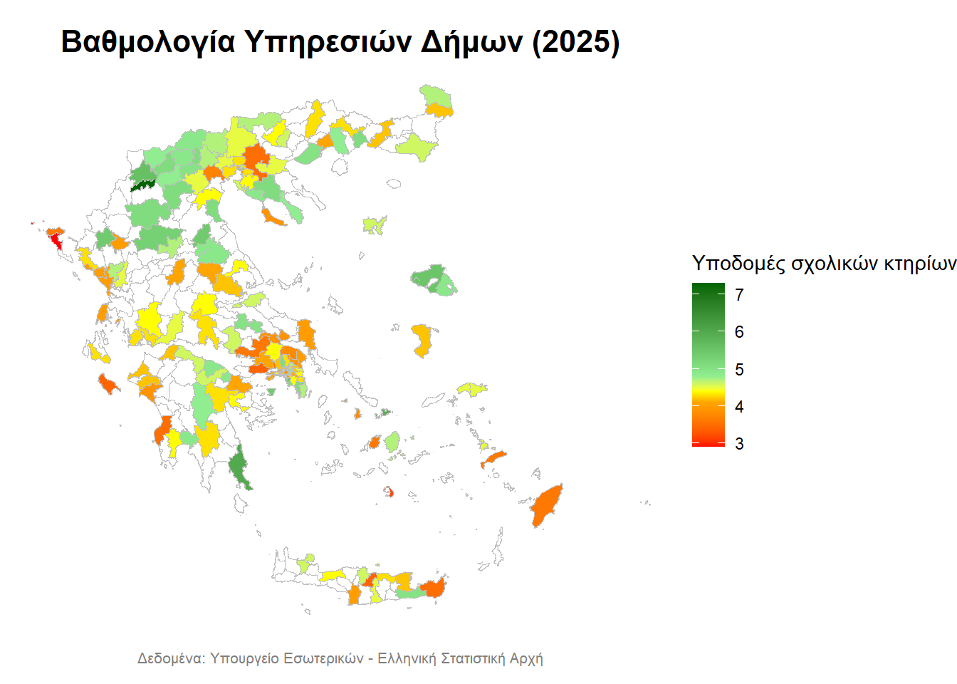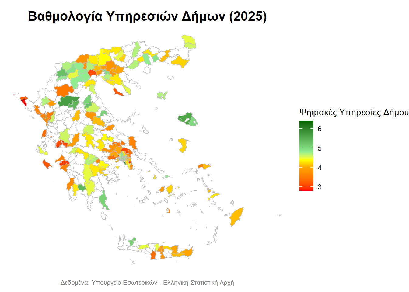 Για την κατασκευή των χαρτών αντλήθηκαν δεδομένα από τα Ψηφιακά Χαρτογραφικά Υπόβαθρα. Ο χρωματισμός των περιοχών έγινε με βάση τη μέση τιμή αξιολόγησης που πέτυχε ο κάθε Δήμος. Συγκεκριμένα: