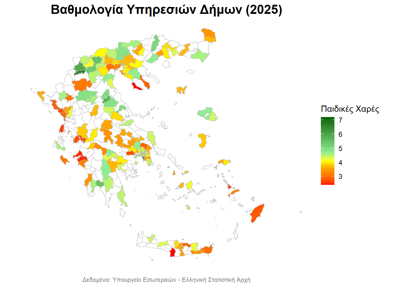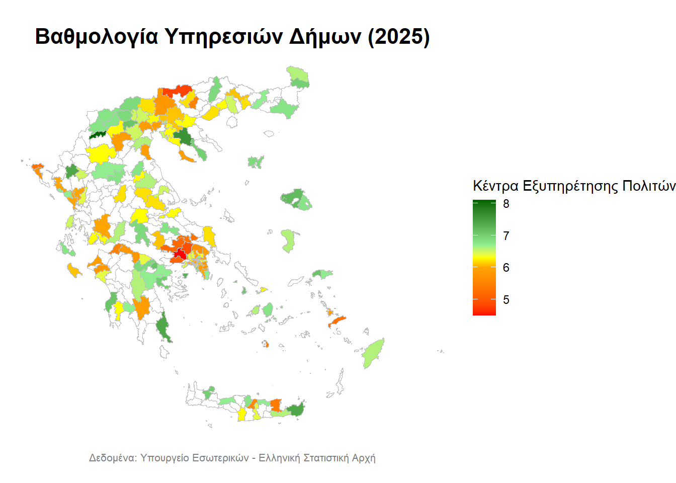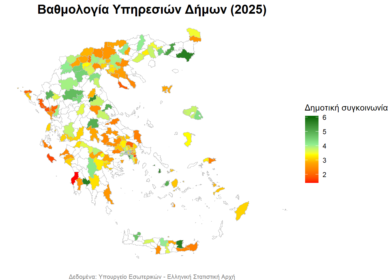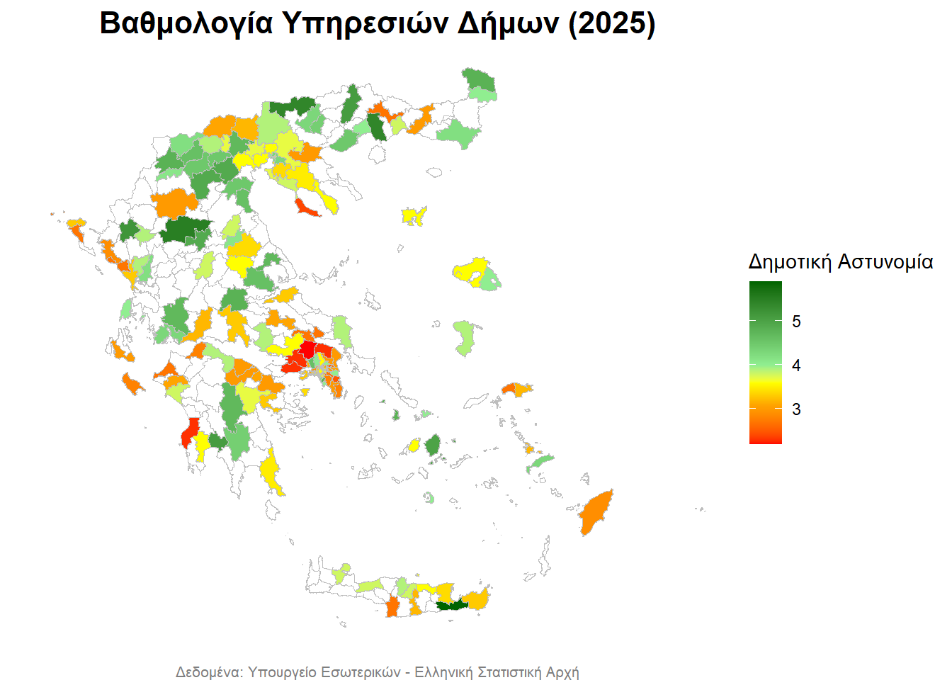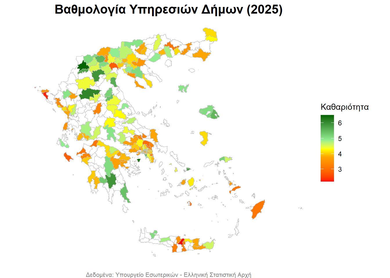 Στην παρούσα σελίδα παρουσιάζεται εποπτικά μέρος των αποτελεσμάτων μιας έρευνας αξιολόγησης των δημόσιων υπηρεσιών που διεξήχθη δημοσκοπικά από το Υπουργείο Εσωτερικών τον Μάιο του 2025 (βλ. εδώ). Οι ερωτηθέντες αξιολόγησαν με έναν βαθμό από το 0 (χάλια) έως το 10 (άριστα) τις διάφορες υπηρεσίες του Δήμου. Παρουσιάζουμε αρχικά σε μορφή πίνακα τα αποτελέσματα.