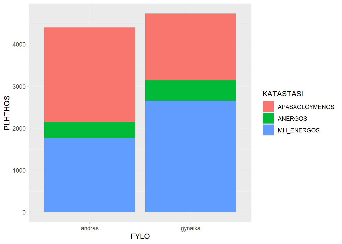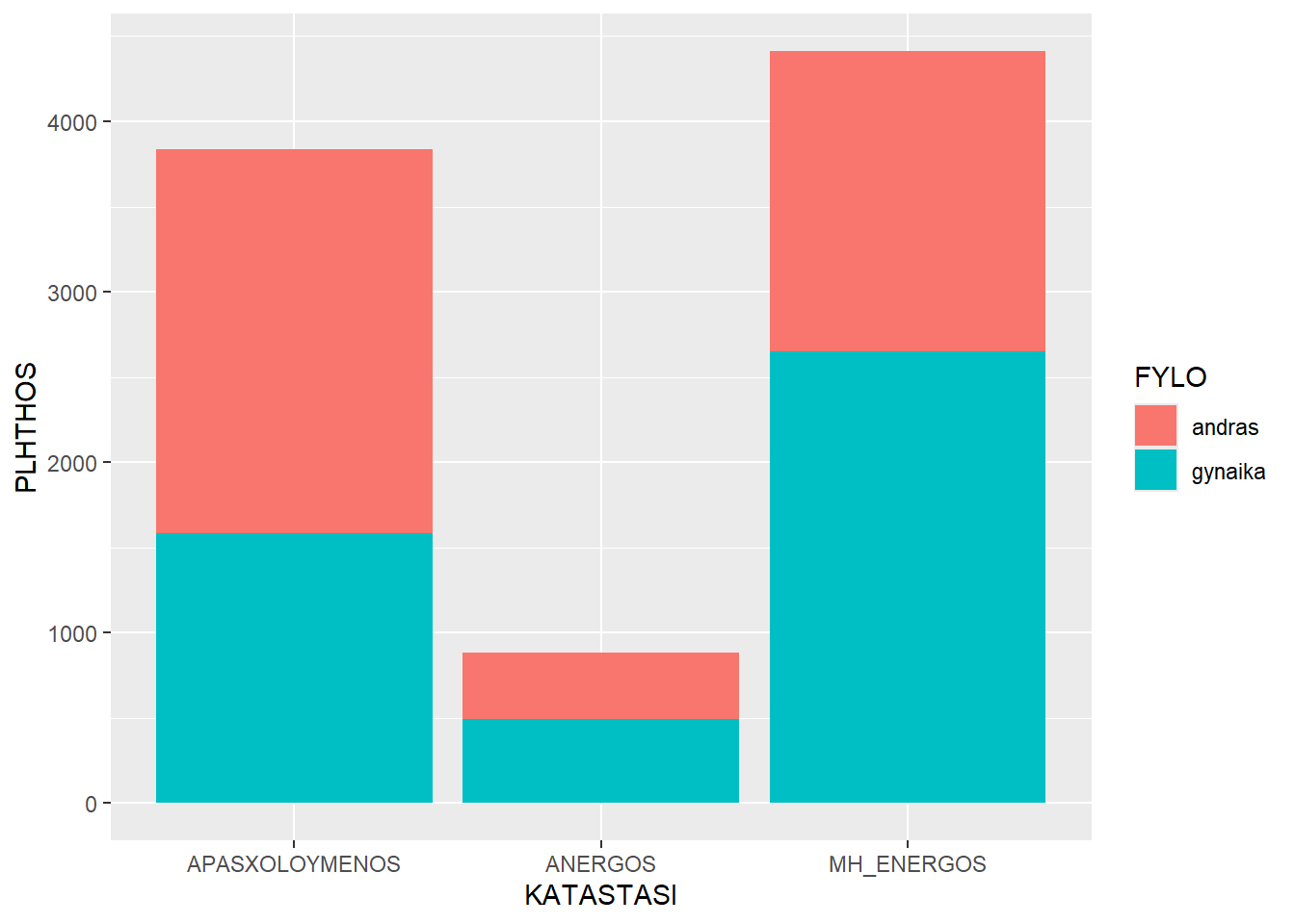 EllFyla <- ggplot(data=ApasxMakri, aes(x=FYLO, y=PLHTHOS, fill=KATASTASI))