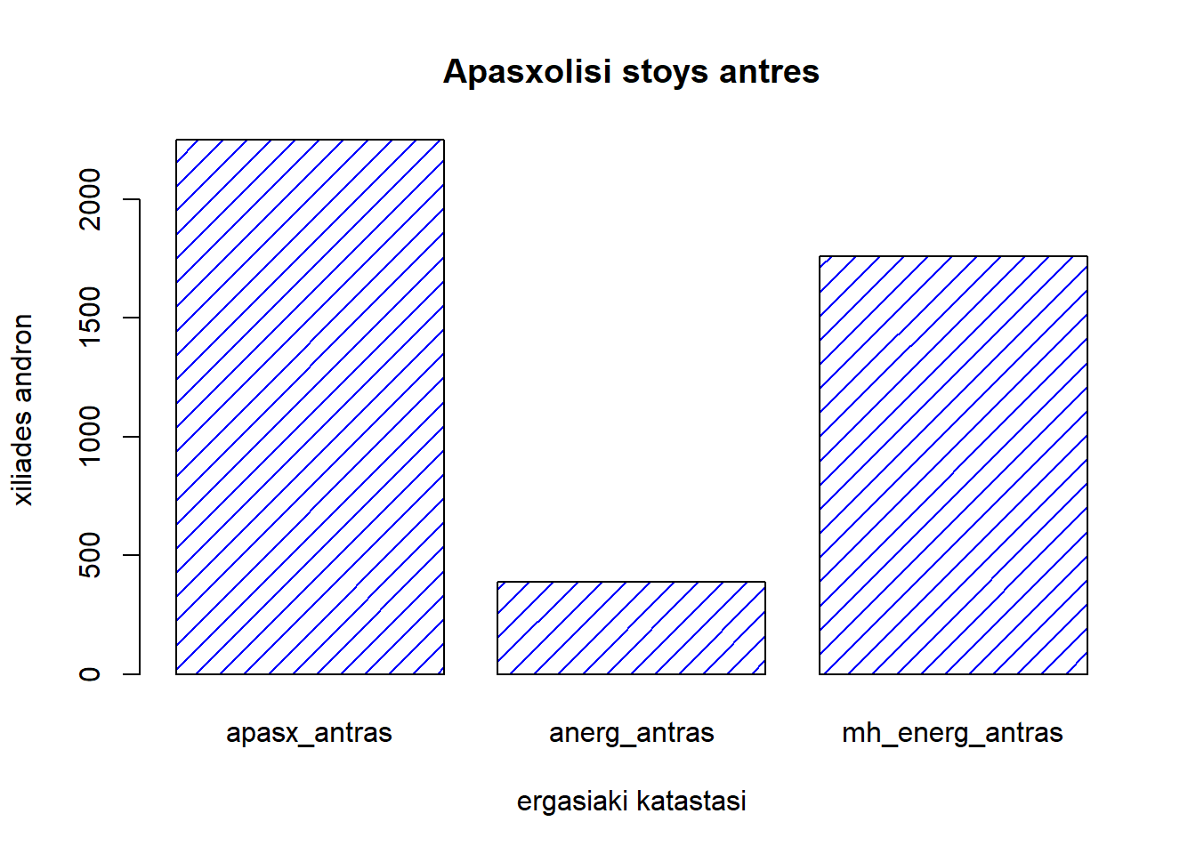 main = "Apasxolisi stoys antres"),xlab = "ergasiaki katastasi"),ylab = "xiliades andron"),col = "blue") καιdensity = 10, αν