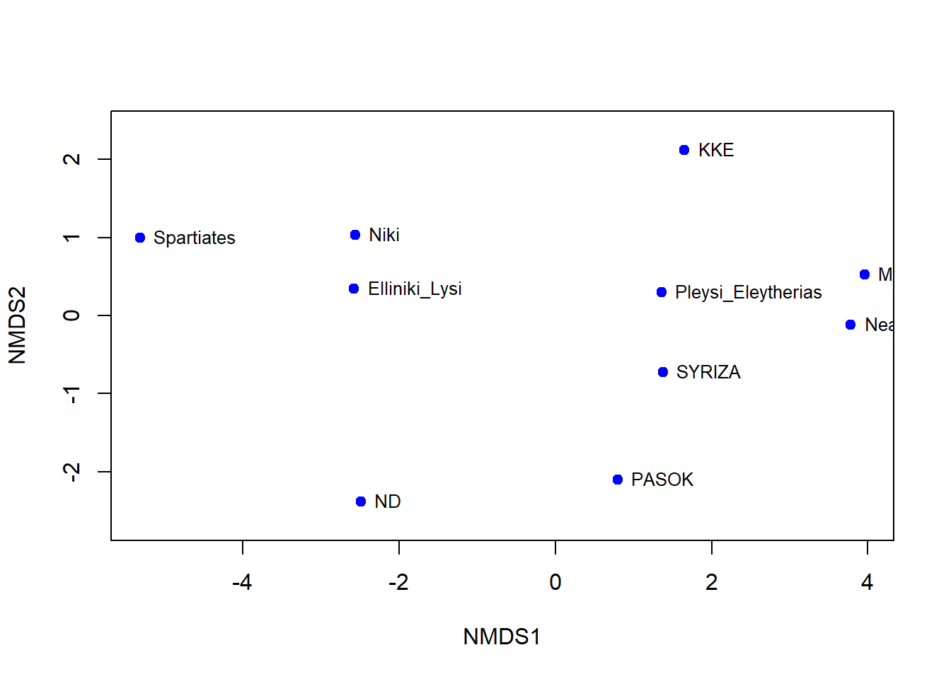Είπαμε πως κάθε ένα από τα 10 κόμματα αναπαρίσταται από μια 22-άδα τιμών που αφορούν τις πολιτικές ταυτότητες. Πόσο πιστά μπορούν αυτές να απεικονιστούν σε λιγότερες από 10 διαστάσεις; Προς τούτο θα χρησιμοποιήσουμε τη διατακτική πολυδιάστατη προσαρμογή κλίμακας (MDS). Θέλοντας να ρίξουμε την ένταση του Kruskal κάτω από 0.05, ώστε να έχουμε εξαιρετικό τρόπο αναπαράστασης, καταλήγουμε να χρειάζονται τρεις διαστάσεις για την αναπαράσταση των αποστάσεων των κομμάτων.