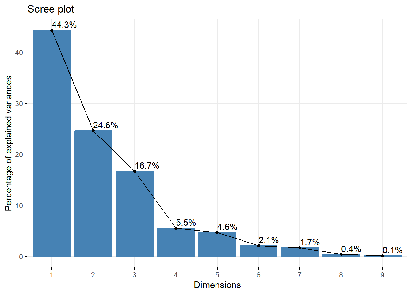 Ας εξετάσουμε αρχικά πόσες διαστάσεις θα είναι ικανοποιητικές για να περιγράψουν τα συμπεράσματα της ανάλυσης αντιστοιχίας. Προς τούτο θα κατασκευάσουμε το γράφημα παραγόντων (scree plot).