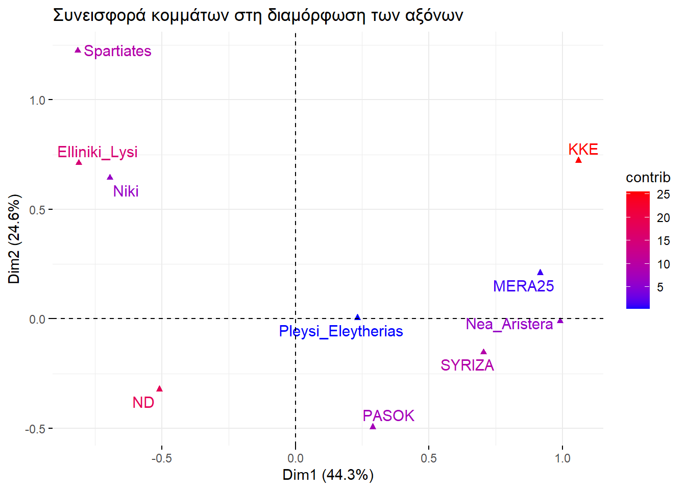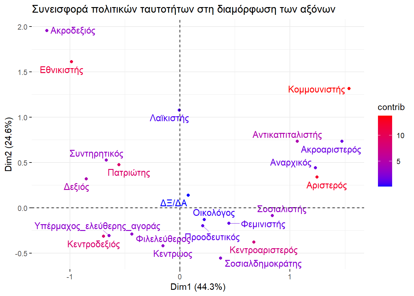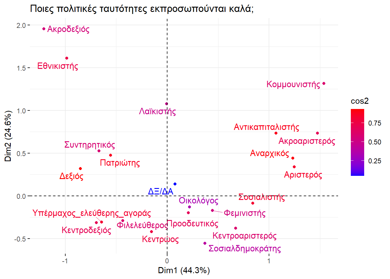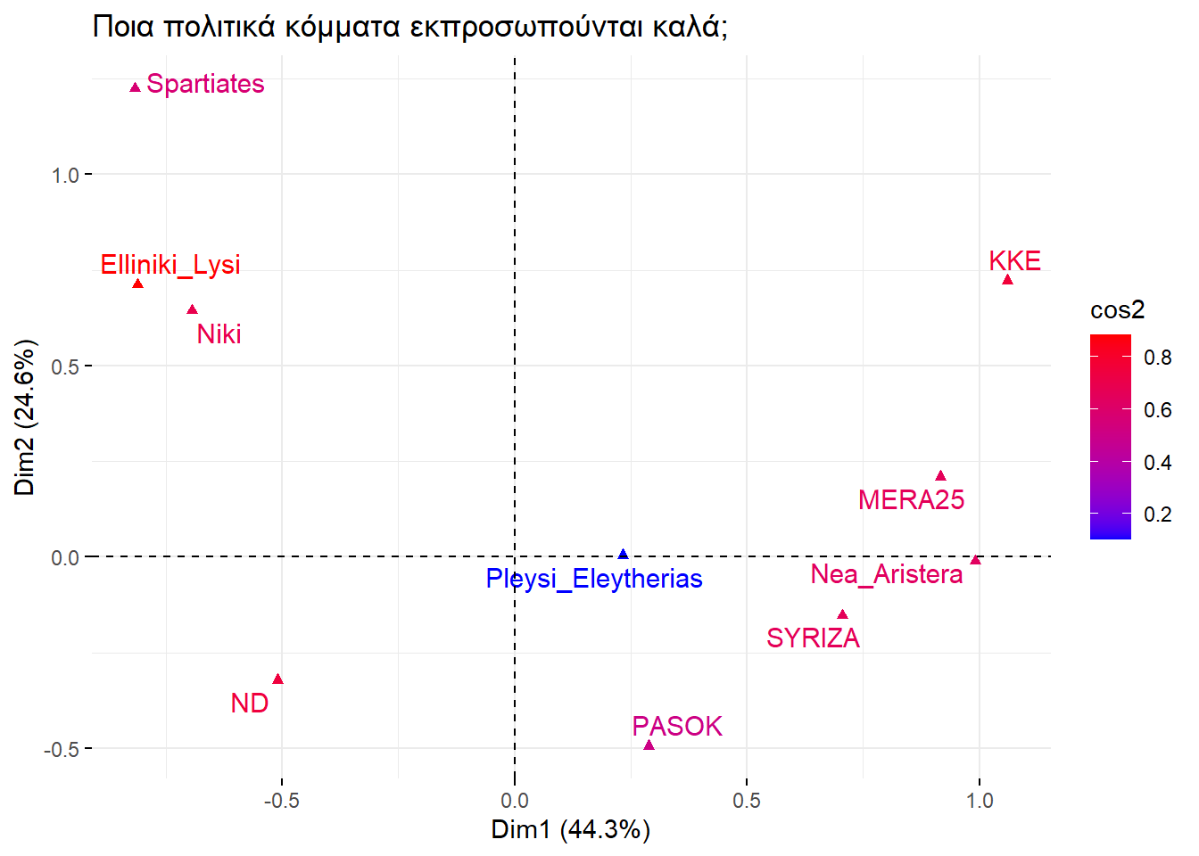 Αφού ερμηνεύσαμε διάφορα στοιχεία του γραφήματος, πάμε να εξετάσουμε τον ρόλο των αξόνων. Αυτοί ποσοτικοποιούν την διαφοροποίηση των σφαιρών επιρροής των κομμάτων και των πολιτικών ταυτοτήτων. Για να το δούμε ακριβέστερα σε ποια μέρη χωρίζουν τα κόμματα και τις πολιτικές ταυτότητες, θα χρειαστεί να δούμε ποια κόμματα και ποιες πολιτικές ταυτότητες εκπροσωπούνται καλά με αυτό το πλήθος διαστάσεων. Τα παρακάτω γραφήματα δείχνουν με κόκκινο τα κόμματα και τις πολιτικές ταυτότητες πολιτικές ταυτότητες που έχουν καλή εκπροσώπηση στο σχήμα μας.