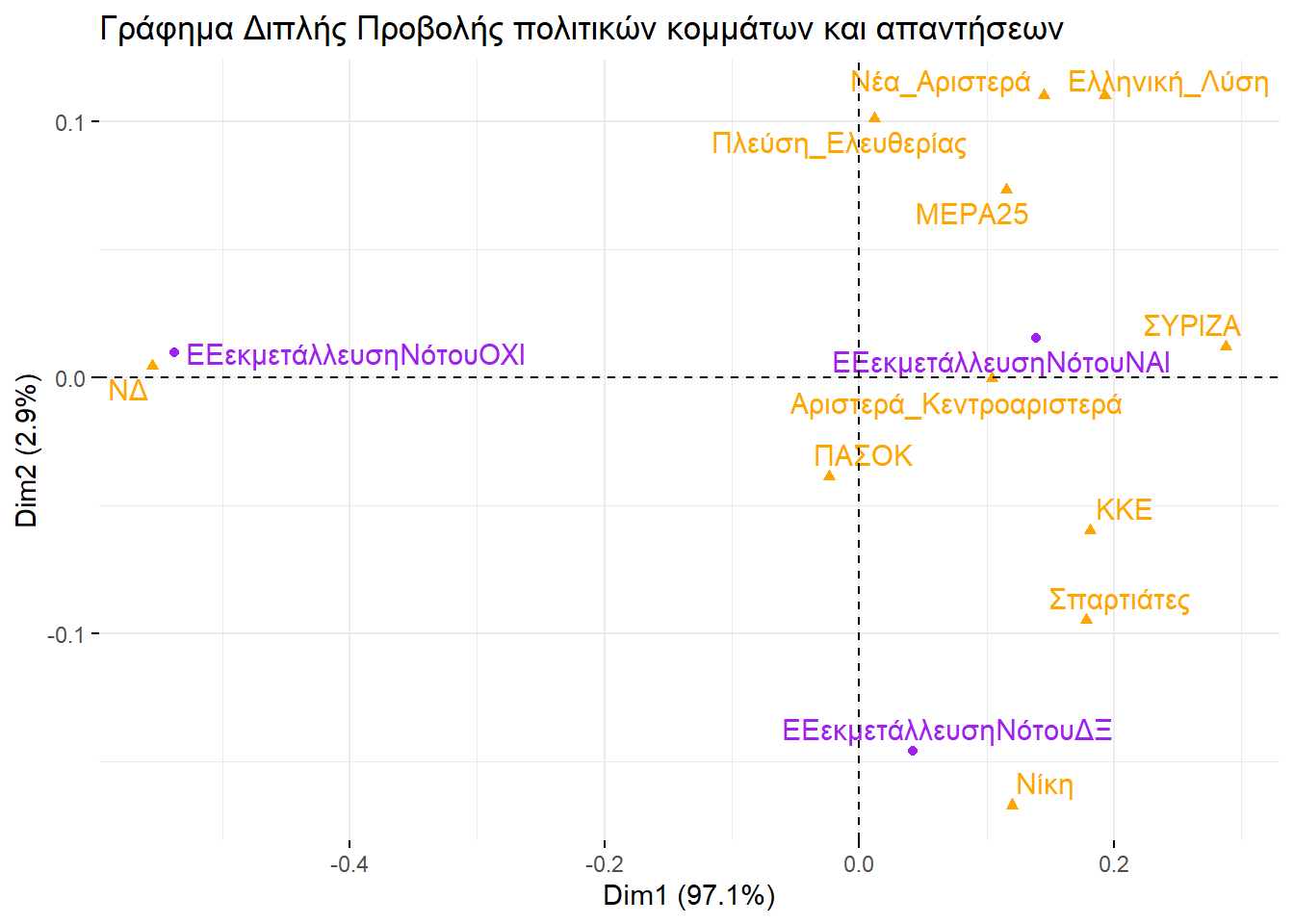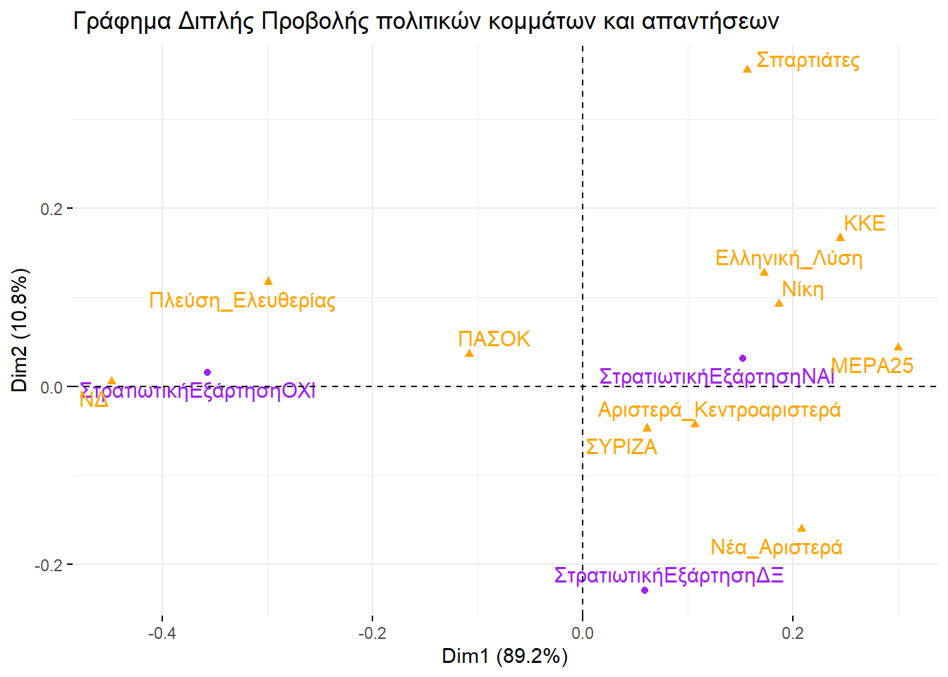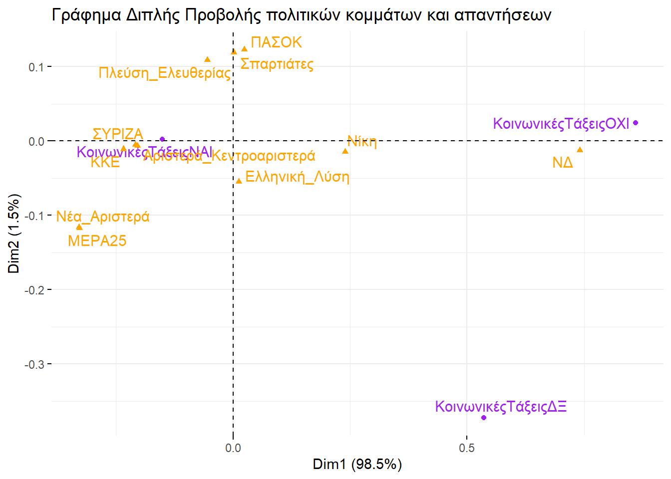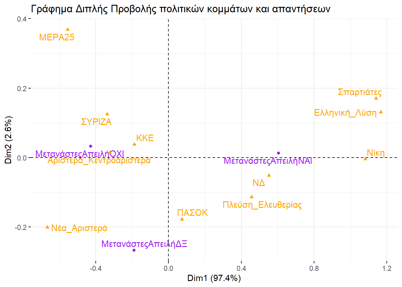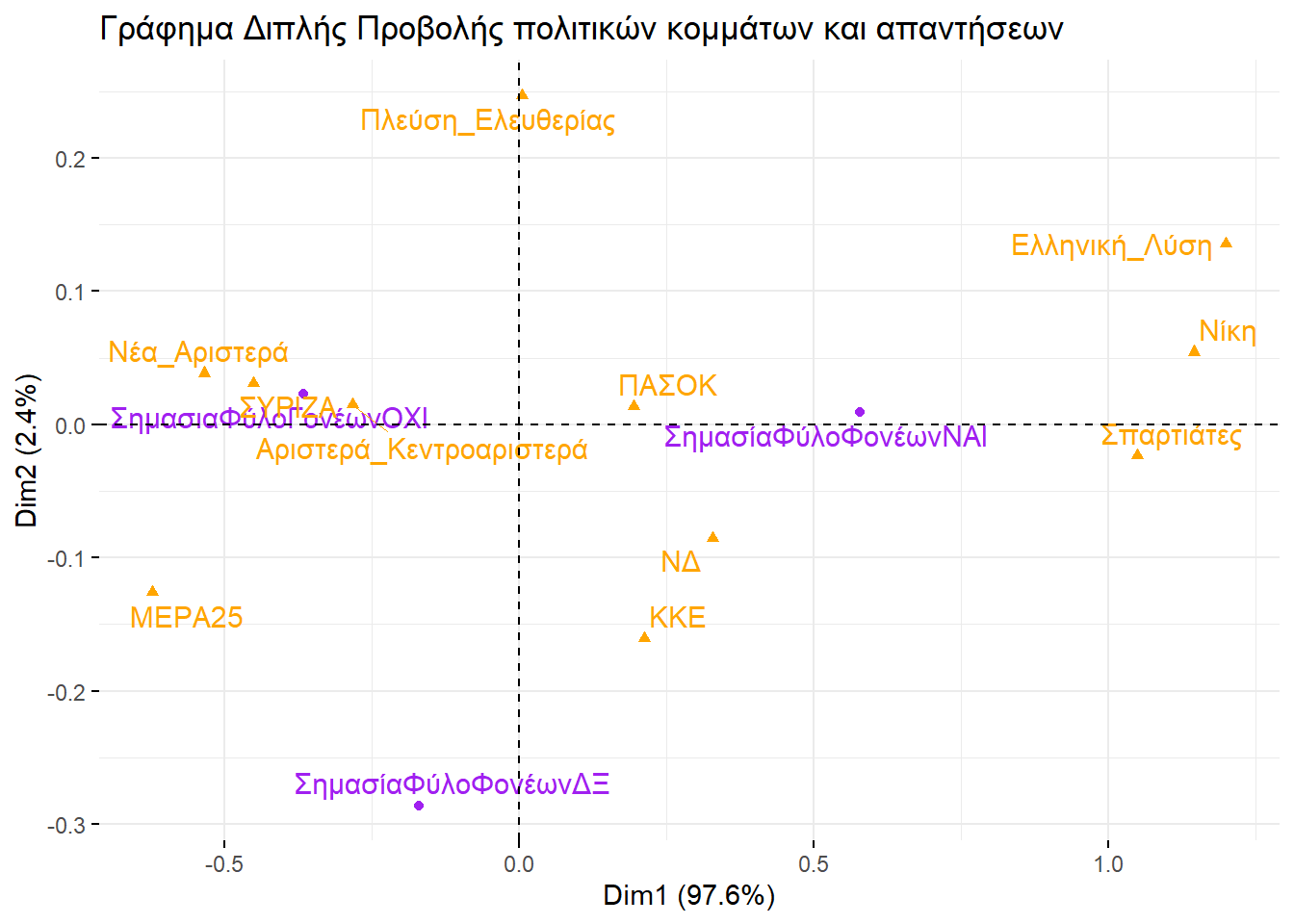 Εξετάζοντάς τα, θα μπορούσαμε να βγάλουμε παρόμοιο συμπέρασμα και με την απεικόνιση στην περίπτωση της πολυδιάστατης προσαρμογής κλίμακας. Ο οριζόντιος άξονας ξεχωρίζει την αριστερά από τη δεξιά, ενώ ο κατακόρυφος θα μπορούσαμε να πούμε ότι αποτυπώνει το βαθμό που ένα κόμμα διαχειρίζεται το σύστημα ή επιδιώκει τη ρίξη με αυτό.