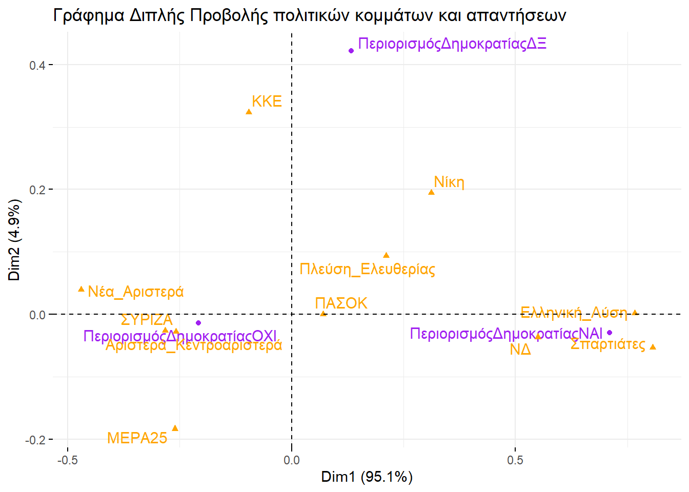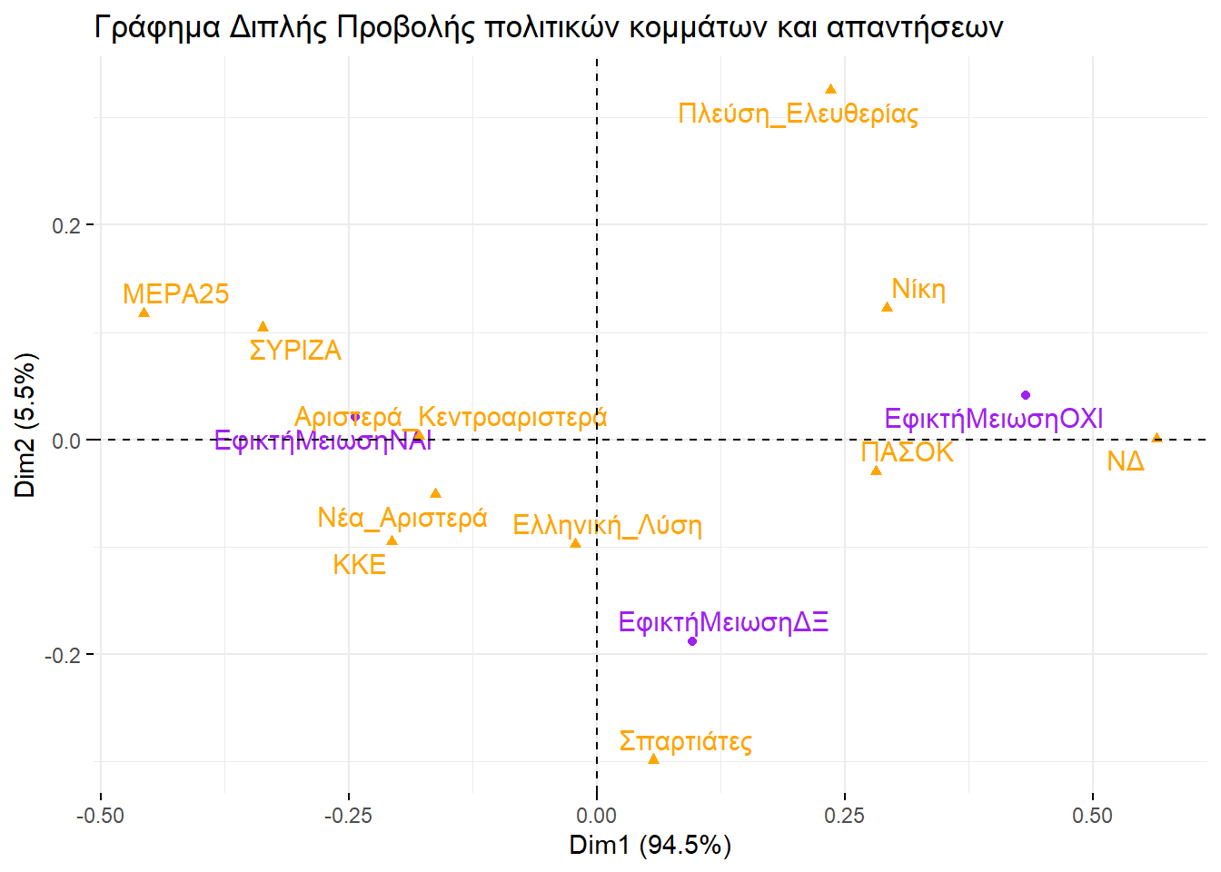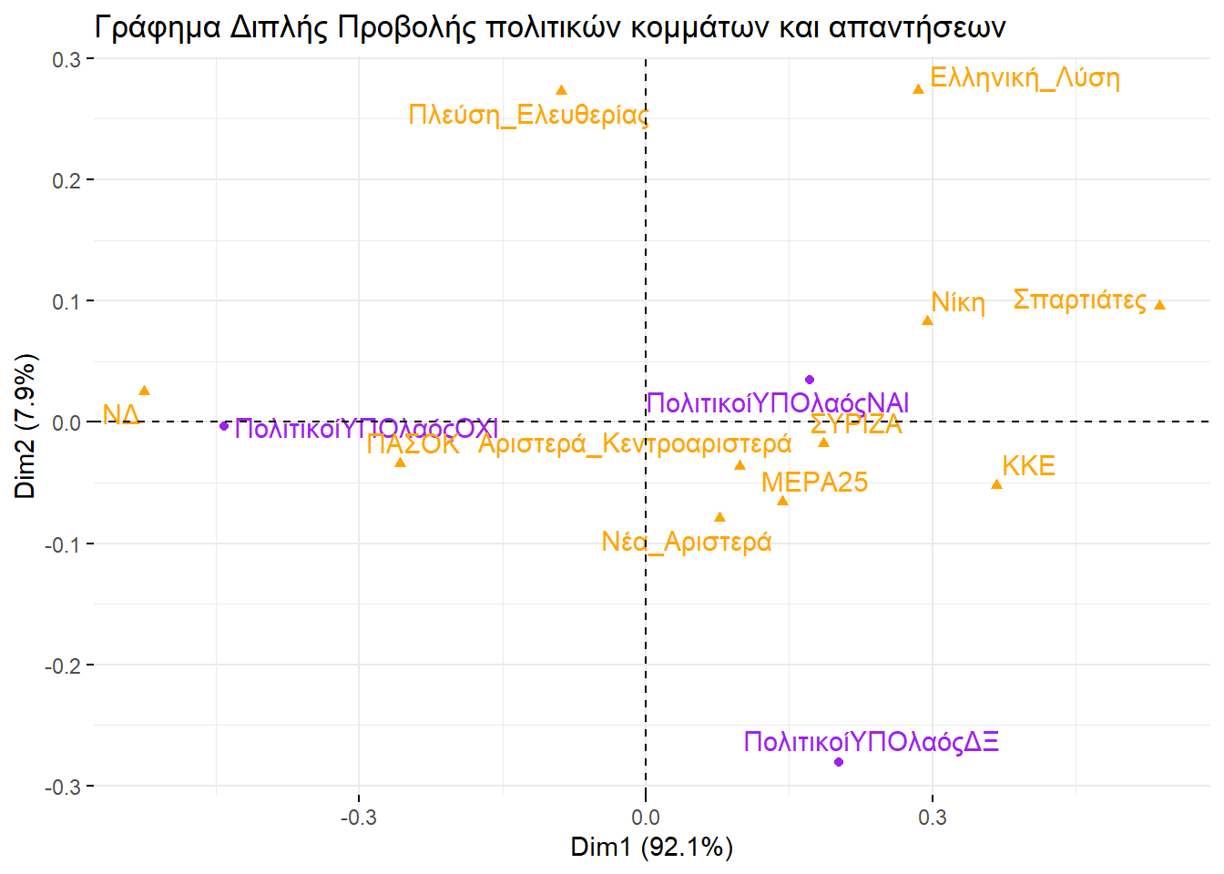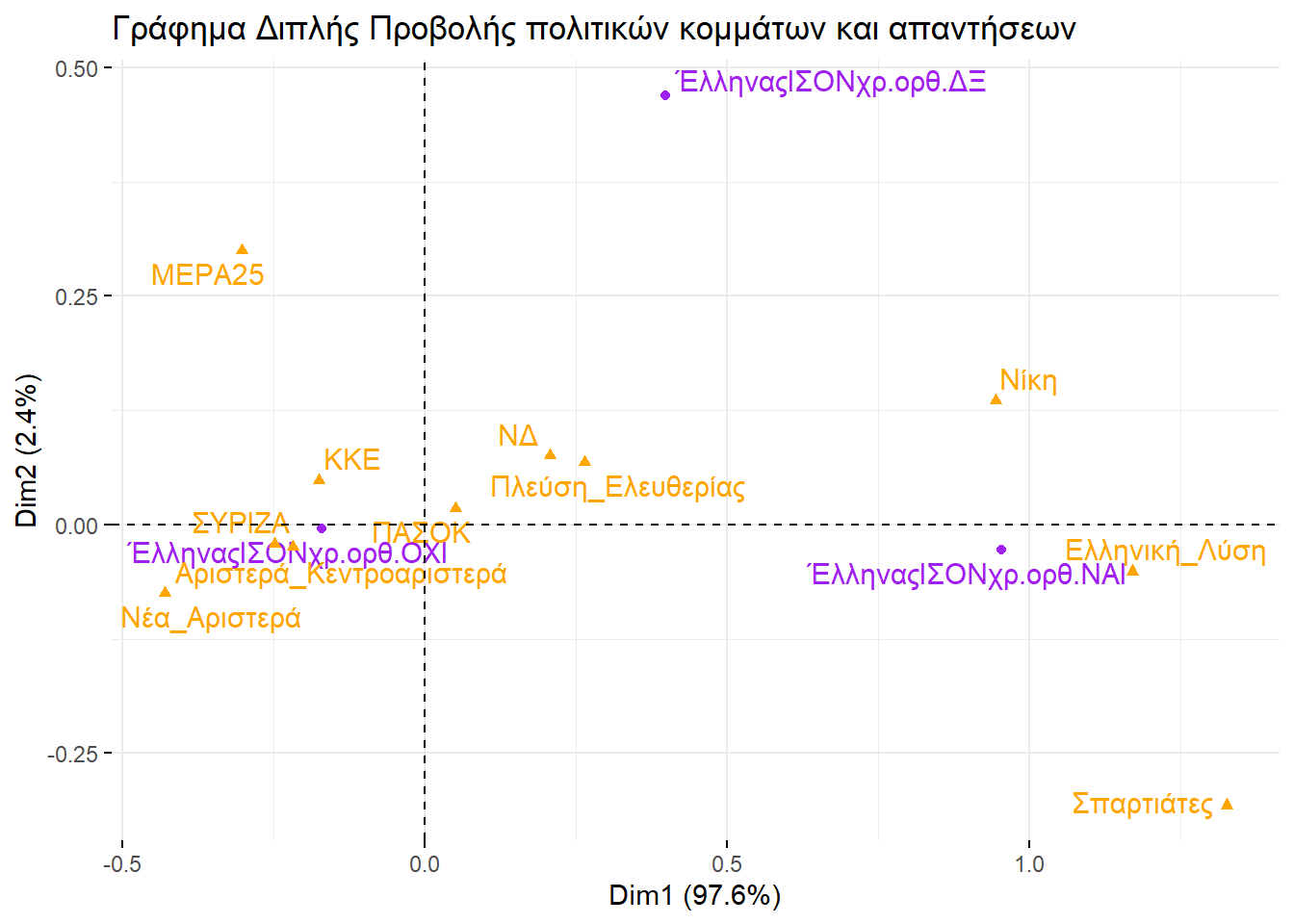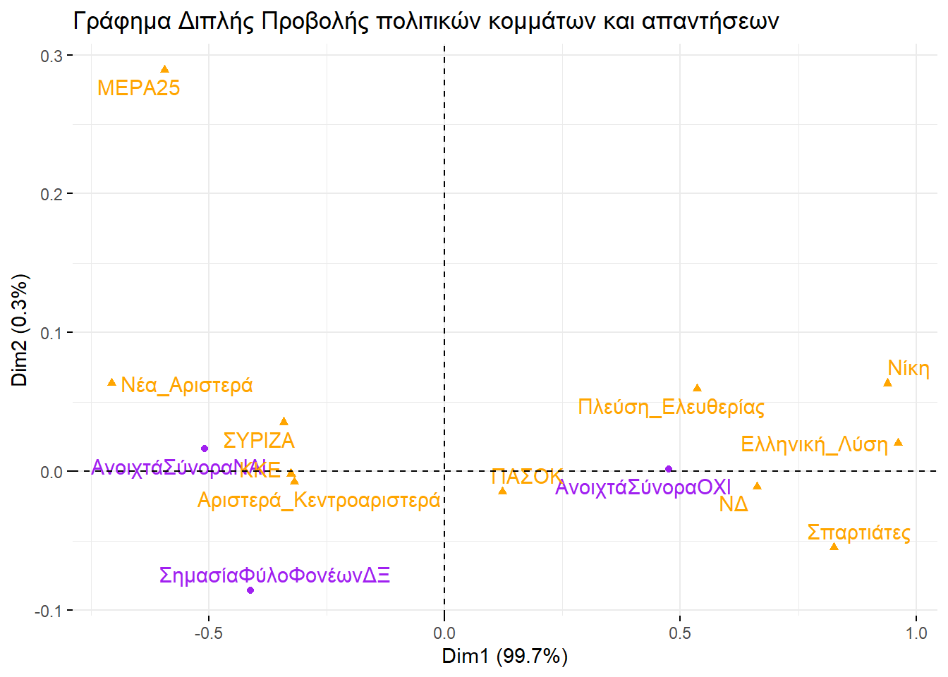 Εξετάζοντάς τα, θα μπορούσαμε να βγάλουμε παρόμοιο συμπέρασμα και με την απεικόνιση στην περίπτωση της πολυδιάστατης προσαρμογής κλίμακας. Ο οριζόντιος άξονας ξεχωρίζει την αριστερά από τη δεξιά, ενώ ο κατακόρυφος θα μπορούσαμε να πούμε ότι αποτυπώνει το βαθμό που ένα κόμμα διαχειρίζεται το σύστημα ή επιδιώκει τη ρίξη με αυτό.