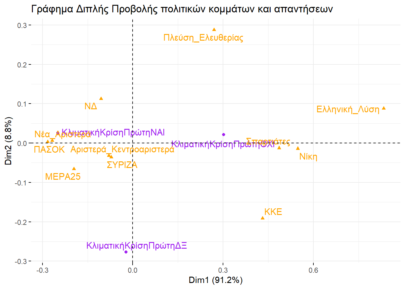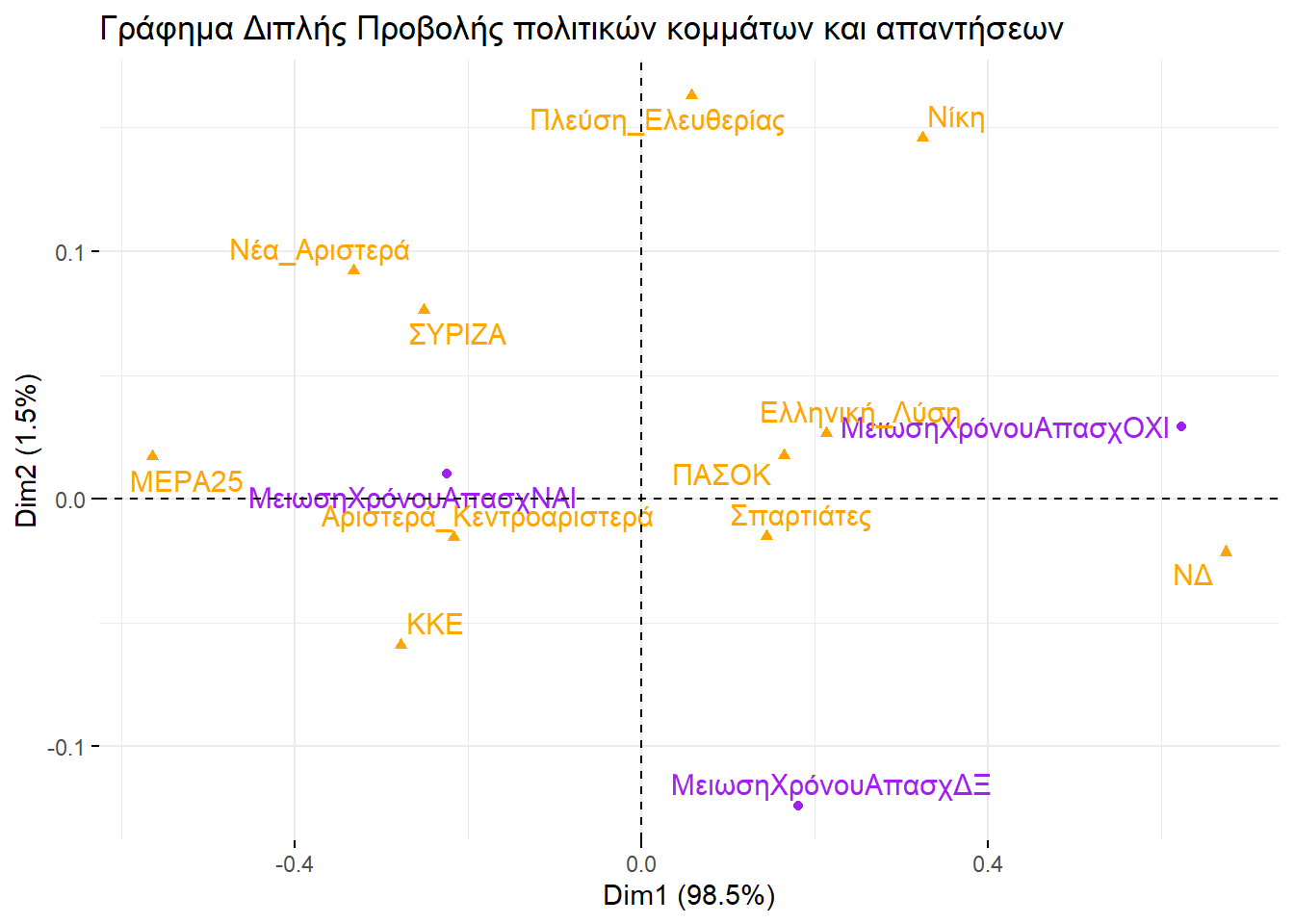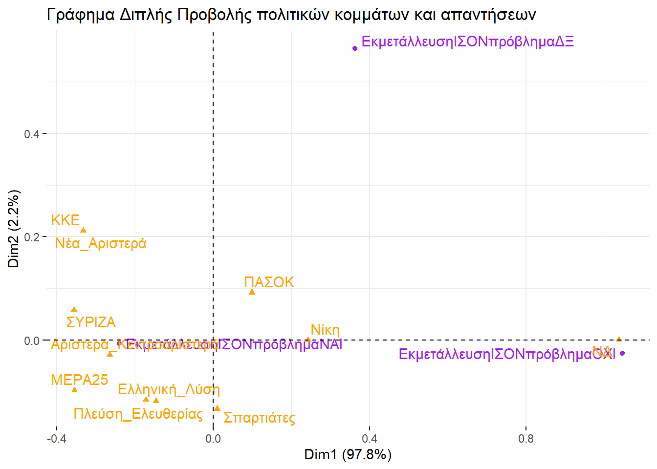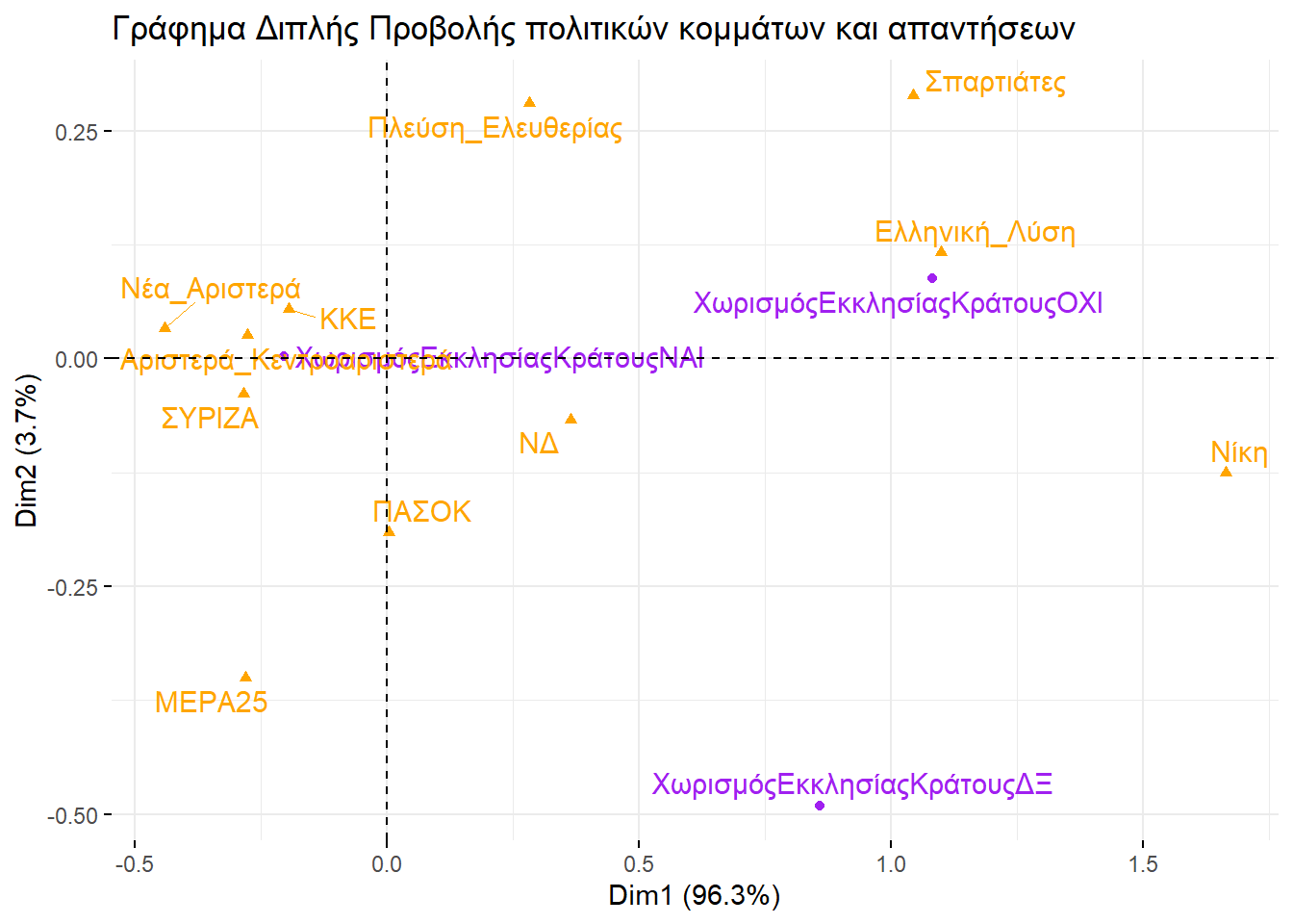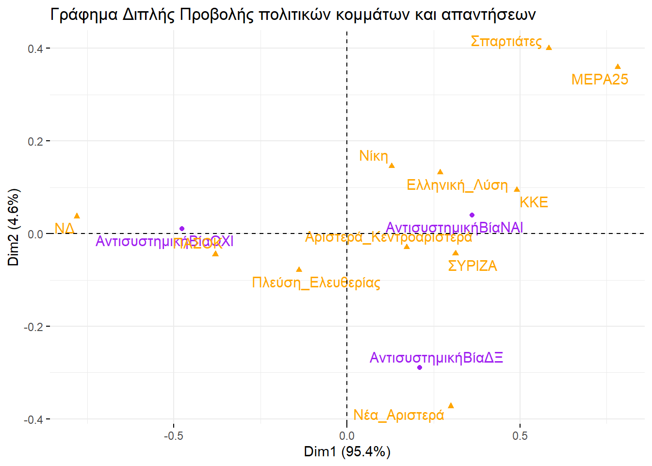 Εξετάζοντάς τα, θα μπορούσαμε να βγάλουμε παρόμοιο συμπέρασμα και με την απεικόνιση στην περίπτωση της πολυδιάστατης προσαρμογής κλίμακας. Ο οριζόντιος άξονας ξεχωρίζει την αριστερά από τη δεξιά, ενώ ο κατακόρυφος θα μπορούσαμε να πούμε ότι αποτυπώνει το βαθμό που ένα κόμμα διαχειρίζεται το σύστημα ή επιδιώκει τη ρίξη με αυτό.