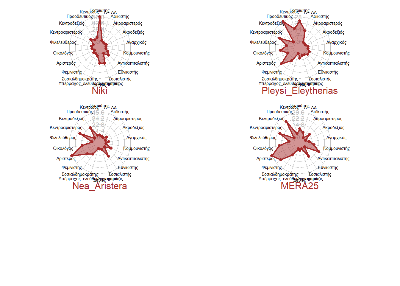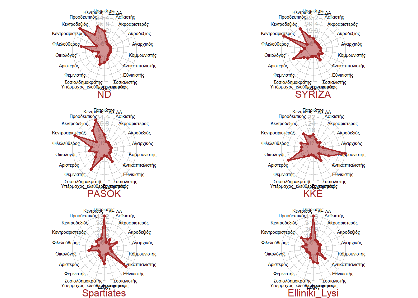 Μπορούμε να πούμε ότι με εξαίρεση την Πλεύση Ελευθερίας και το ΔΞ/ΔΑ, όλα τα κόμματα έχουν καλή εκπροσώπηση στο διάγραμμα διπλής προβολής. Σε δεύτερη φάση, λοιπόν, θα εξετάσουμε τα κόμματα και τις πολιτικές ταυτότητες που διαμορφώνουν τους άξονες, ώστε να τους νοηματοδοτήσουμε. Στα παρακάτω σχήματα με κόκκινο πάλι παριστάνονται ακριβώς αυτά που τους διαμορφώνουν πιο έντονα.