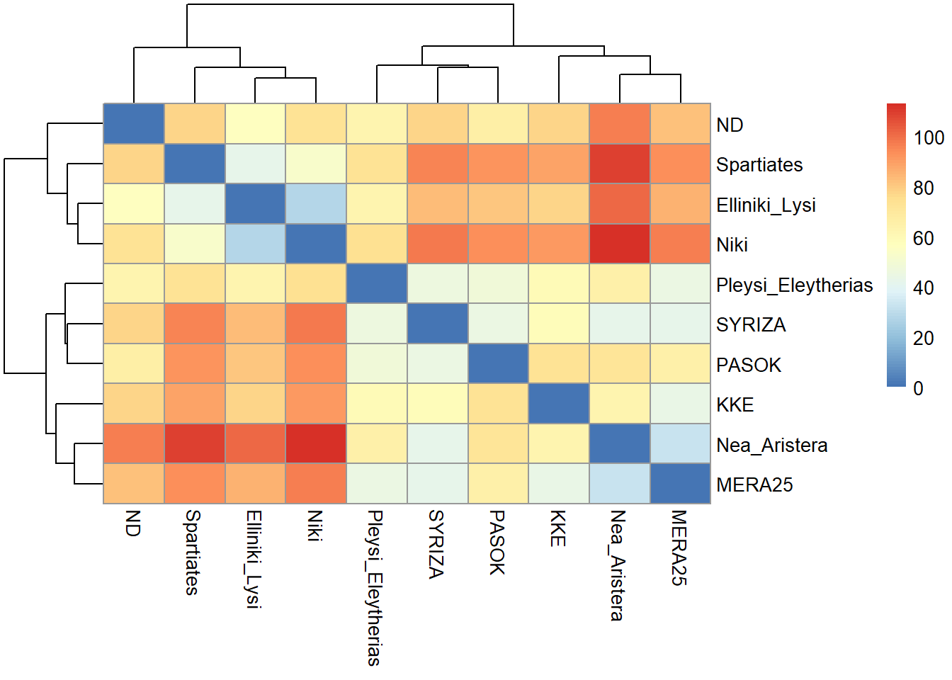 Ας πάμε να ελέγξουμε και γραφικά τη εγγύτητα των διαφόρων κομμάτων με ένα δεντρόγραμμα και μια μήτρα απόστασης. Να σημειώσουμε εδώ ότι όσο πιο ψυχρό είναι ένα κελί του κάτωθι πίνακα, τόσο μεγαλύτερη εγγύτητα έχουμε στα κόμματα που διασταυρώνονται εκεί.