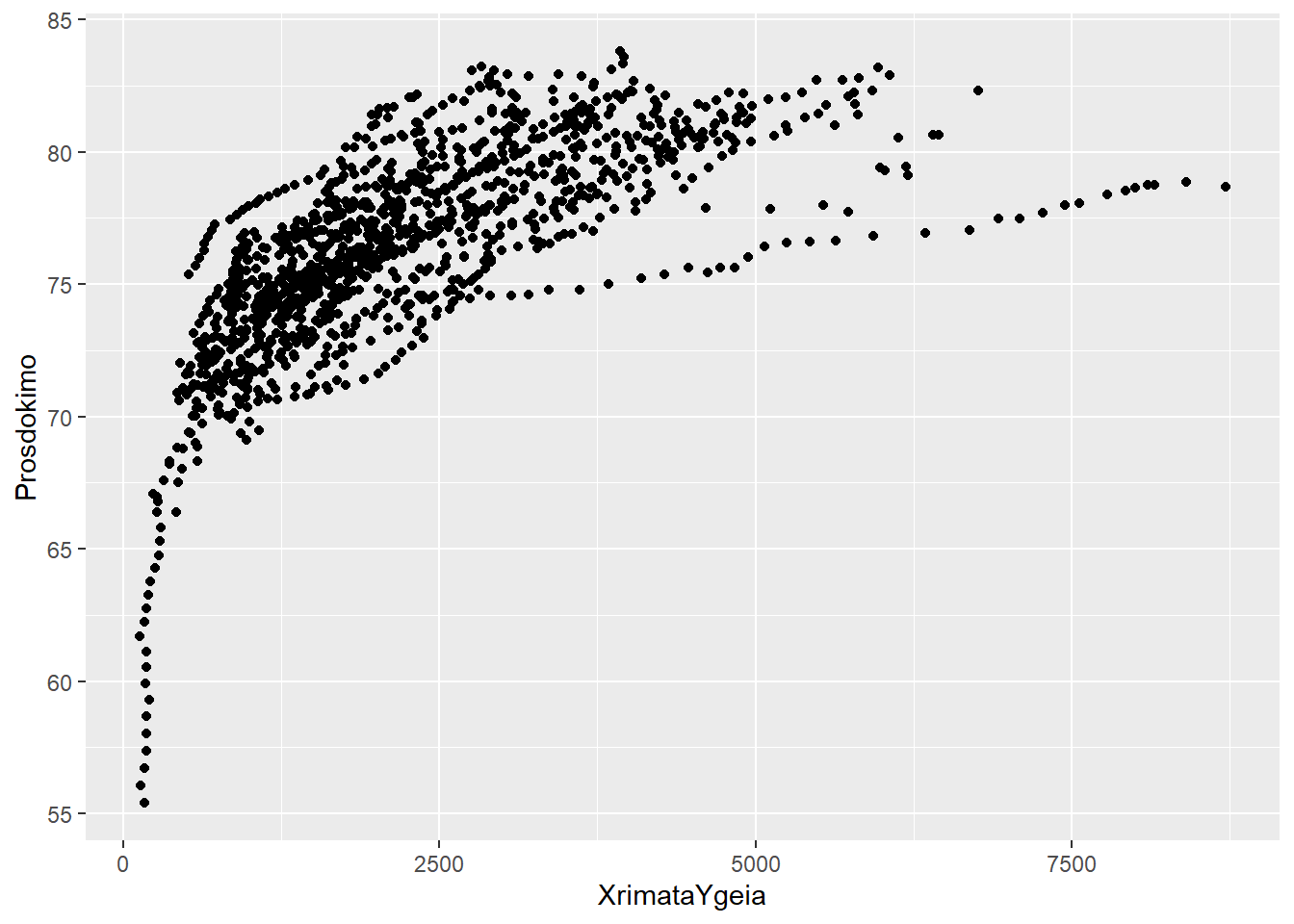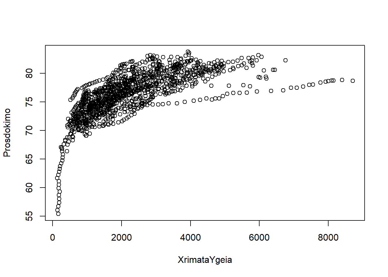 XrimataYgeia <- ProsdokimoVSperith2$Health.Expenditure.and.Financing..per.capita...OECDstat..2017..Πάμε τώρα στο ζουμί της υπόθεσης! Ένας τρόπος, λοιπόν, να παραστήσουμε με γραφικό τρόπο τη σχέση μεταξύ του προσδόκιμου ζωής και των δαπανούμενων χρημάτων για την υγεία είναι το διάγραμμα διασποράς. Δηλαδή η μία μεταβλητή, τα χρήματα που επενδύονται στην υγεία, αναπαρίσταται σ’ έναν οριζόντιο άξονα, η άλλη μεταβλητή, το προσδόκιμο ζωής, αναπαρίσταται σ’ έναν κατακόρυφο και μια πλειάδα από σημεία δηλώνει τις μεταξύ τους αντιστοιχίες.
