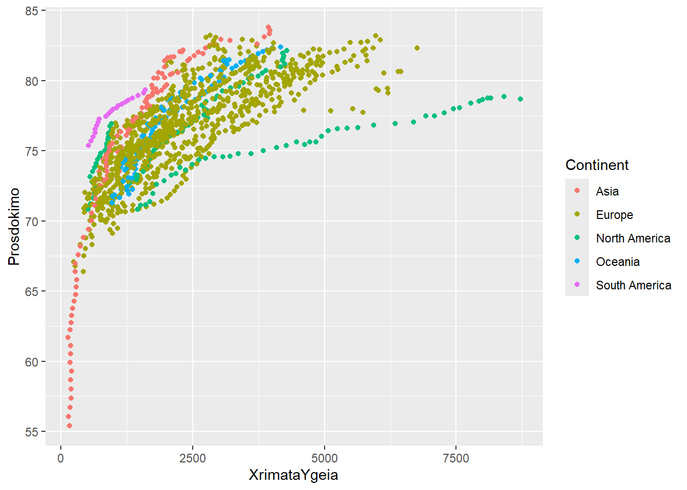 ProsdXrhmata + geom_point(aes(colour = Continent))