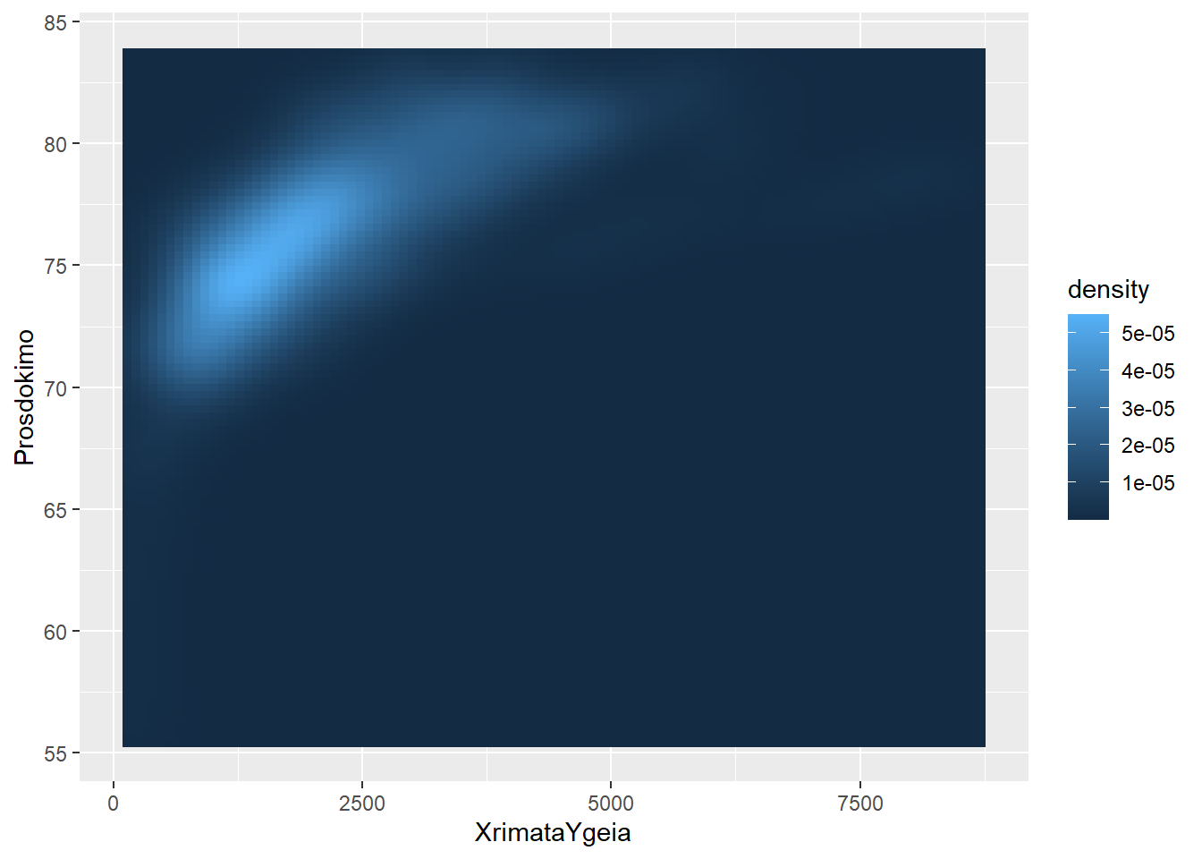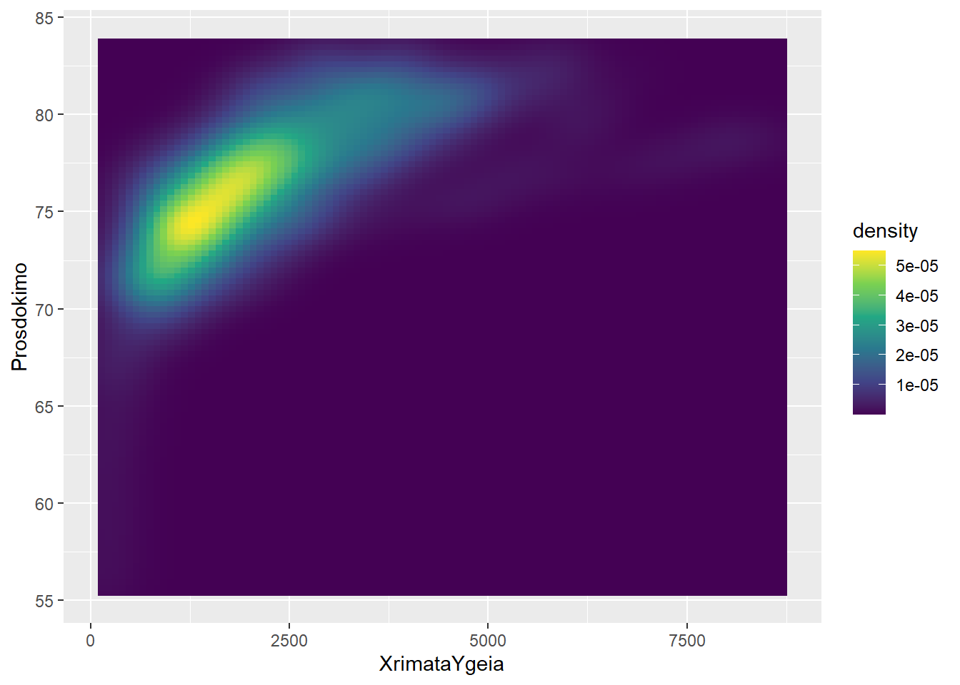 ProsdXrhmata + stat_density_2d(geom = "raster", aes(fill = after_stat(density)), contour = FALSE)