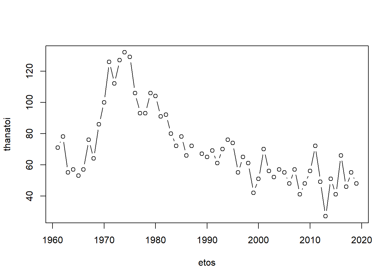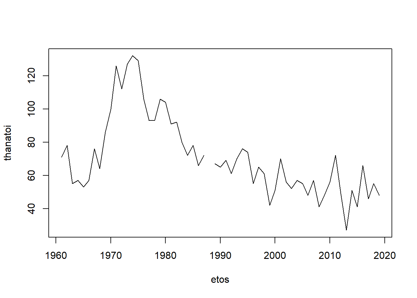 Παρατηρώντας το χρονοδιάγραμμα της προηγούμενης ενότητας ή και εκτελώντας τις παρακάτω εντολές διαπιστώνουμε ότι ακραίες τιμές στους θανάτους έχουμε στα έτη 1971 έως 1975 και στο έτος 2013. Σε κάθε μία από αυτές τις περιπτώσεις υπάρχει μια τάση φυγής των τιμών προς την μεριά της μέσης τιμής.