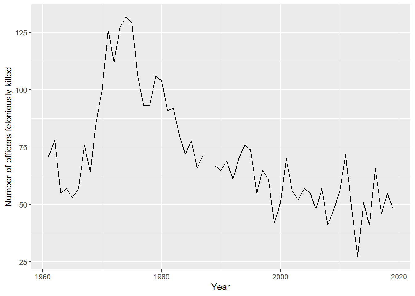 PolDeathGr <- ggplot(ThanatoiAstyn, aes(x=Year, y=`Number of officers feloniously killed`))