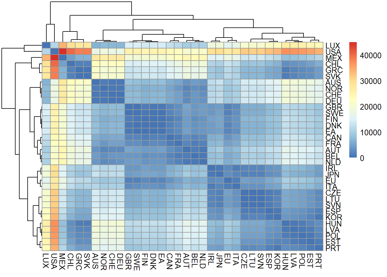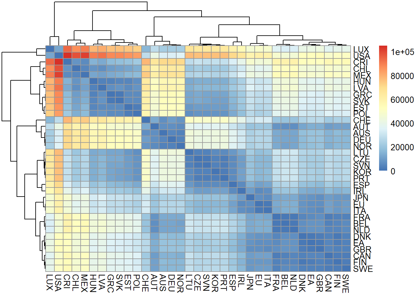 Αν θελήσουμε να εξετάσουμε τις αποστάσεις των χωρών (από άποψη εισοδημάτων των νοικοκυριών, φυσικά) το έτος 2021, γράφουμε: