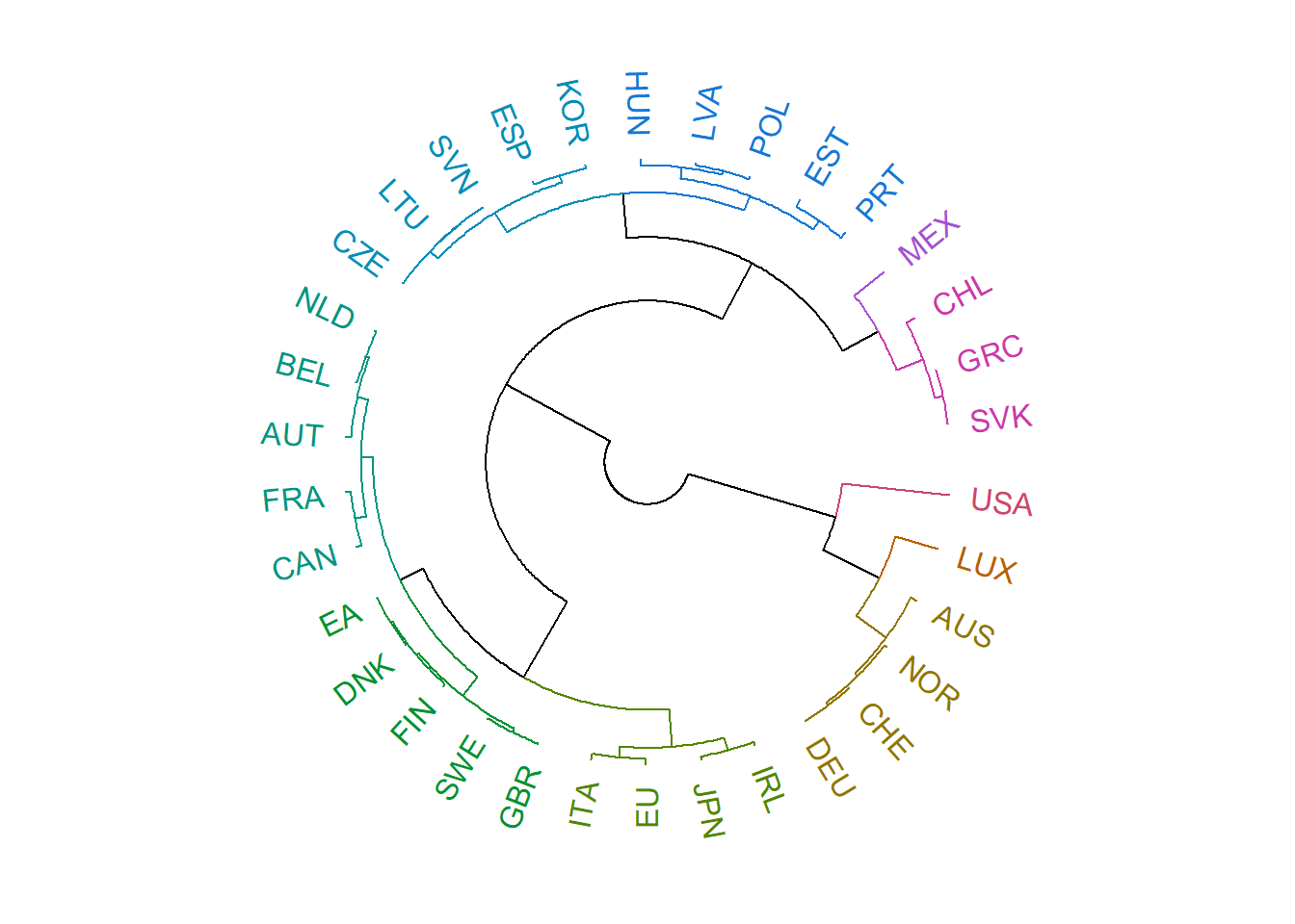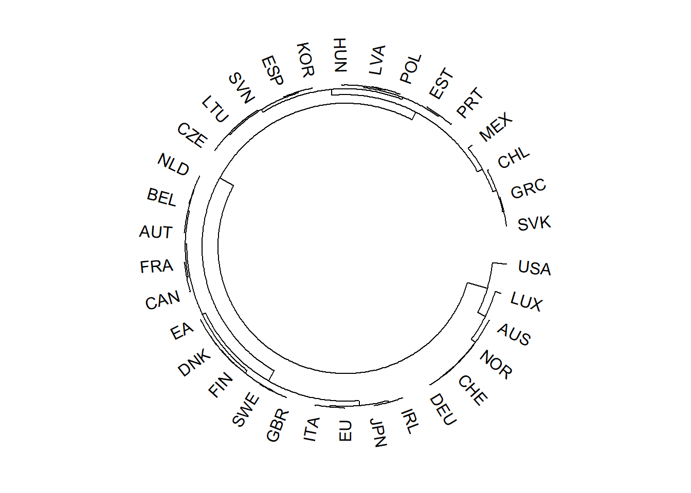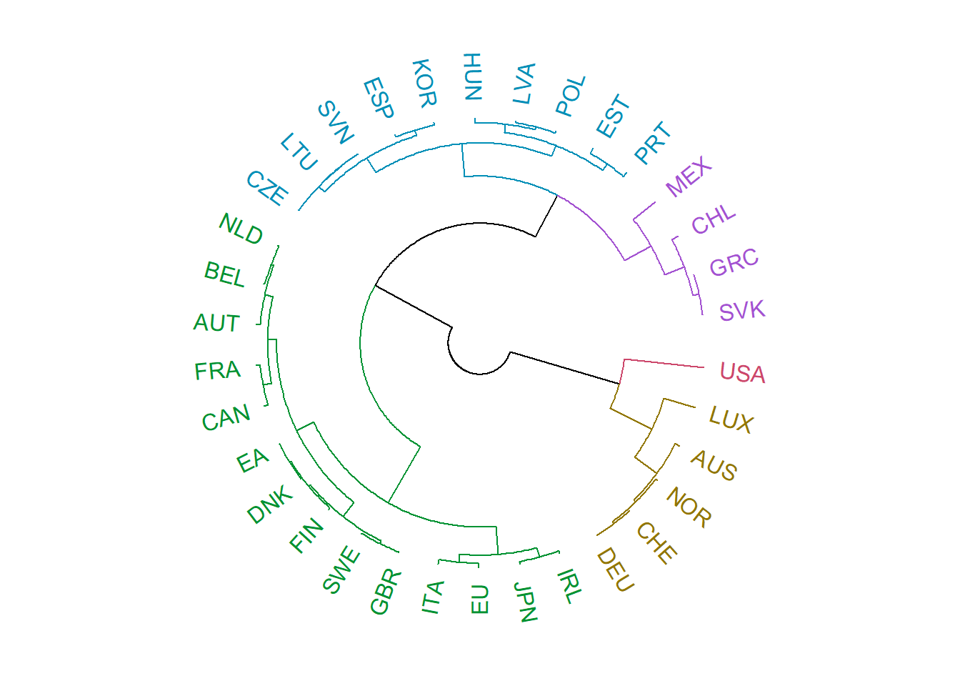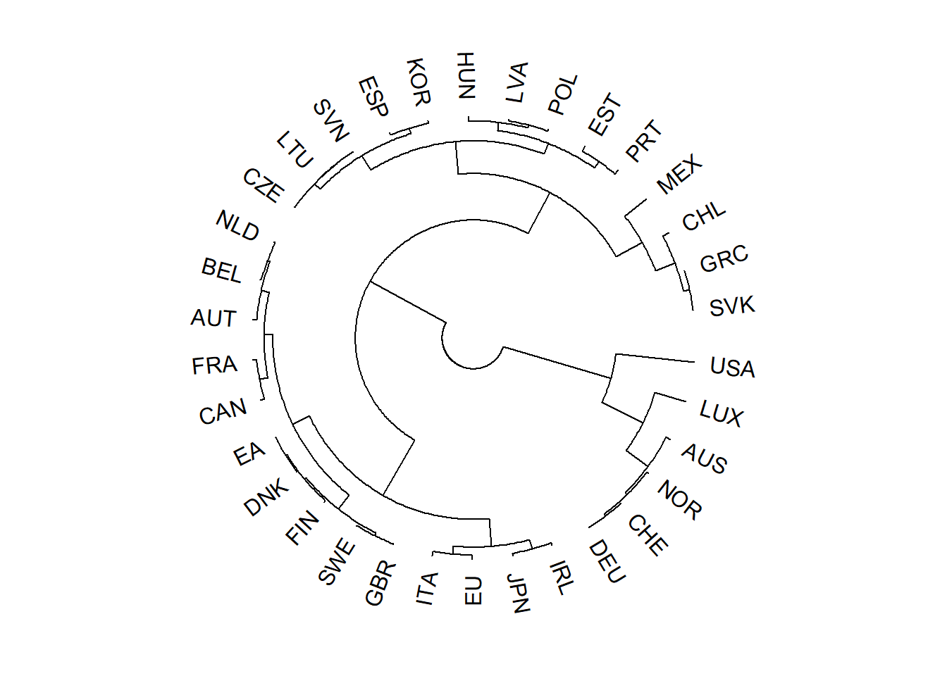 Έτσι προκύπτει ένας πίνακας που αφενός παρουσιάζει τις αποστάσεις μεταξύ των χωρών, αφετέρου ένα δεντρόγραμμα που δείχνει τις ομοδοποιήσεις που σχηματίζονται.