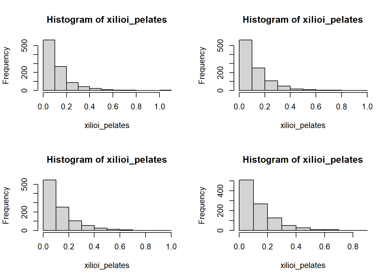 Πάμε τώρα να δούμε τι μας λένε αυτά τα ιστογράμματα. Μας λένε ότι ως επί το πλείστον θα μεσολαβούν από 0 έως 0.1 ώρες (από 0 λεπτά έως 6 λεπτά) από την άφιξη ενός πελάτη, έως και την άφιξη του επόμενου. Είναι, λένε τα ιστογράμματα, σχεδόν απίθανο να μεσολαβήσουν 0.5-0.6 ώρες (30-36 λεπτά) μεταξύ των αφίξεων δύο πελατών.