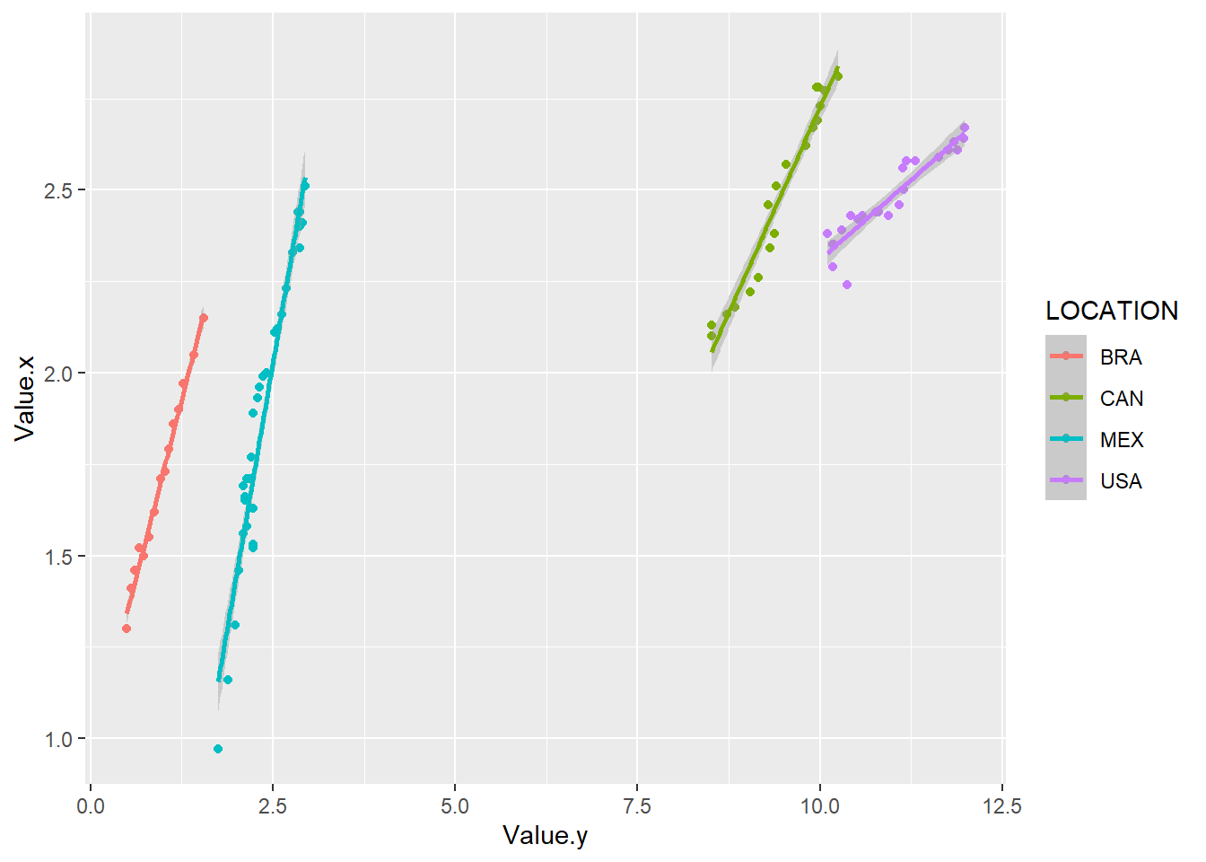 Έτσι έχουμε τις ευθείες γραμμικής παλινδρόμησης για κάθε χώρα της Βορείου Αμερικής. Παρατηρούμε την έντονη γραμμική σύνδεση γιατρών-νοσοκόμων σε κάθε χώρα. Ίσως η κοινή ύπαρξη ευθειών ευθείες να αντικατοπτρίζει μια κοινή προσέγγιση στο σύστημα υγείας, η οποία να εξειδικεύεται διαφορετικά σε κάθε περίπτωση, εξ ου και οι διαφορετικές ευθείες.