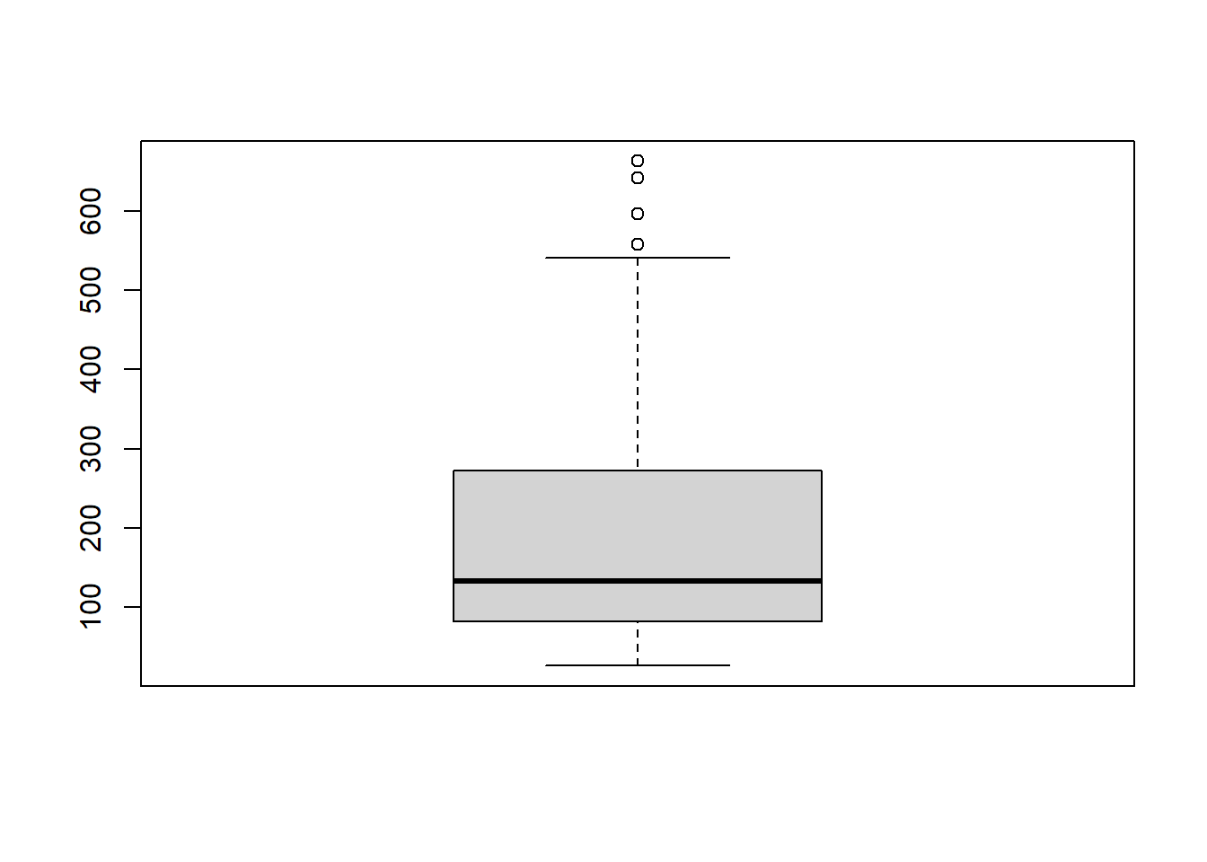 οπότε διαπιστώνουμε ότι το κεντρικό 50% του δείγματος είναι μεταξύ των τιμών 82.5 και 271.5, οι οποίες, προφανώς, απέχουν μεταξύ τους 189 μονάδες.