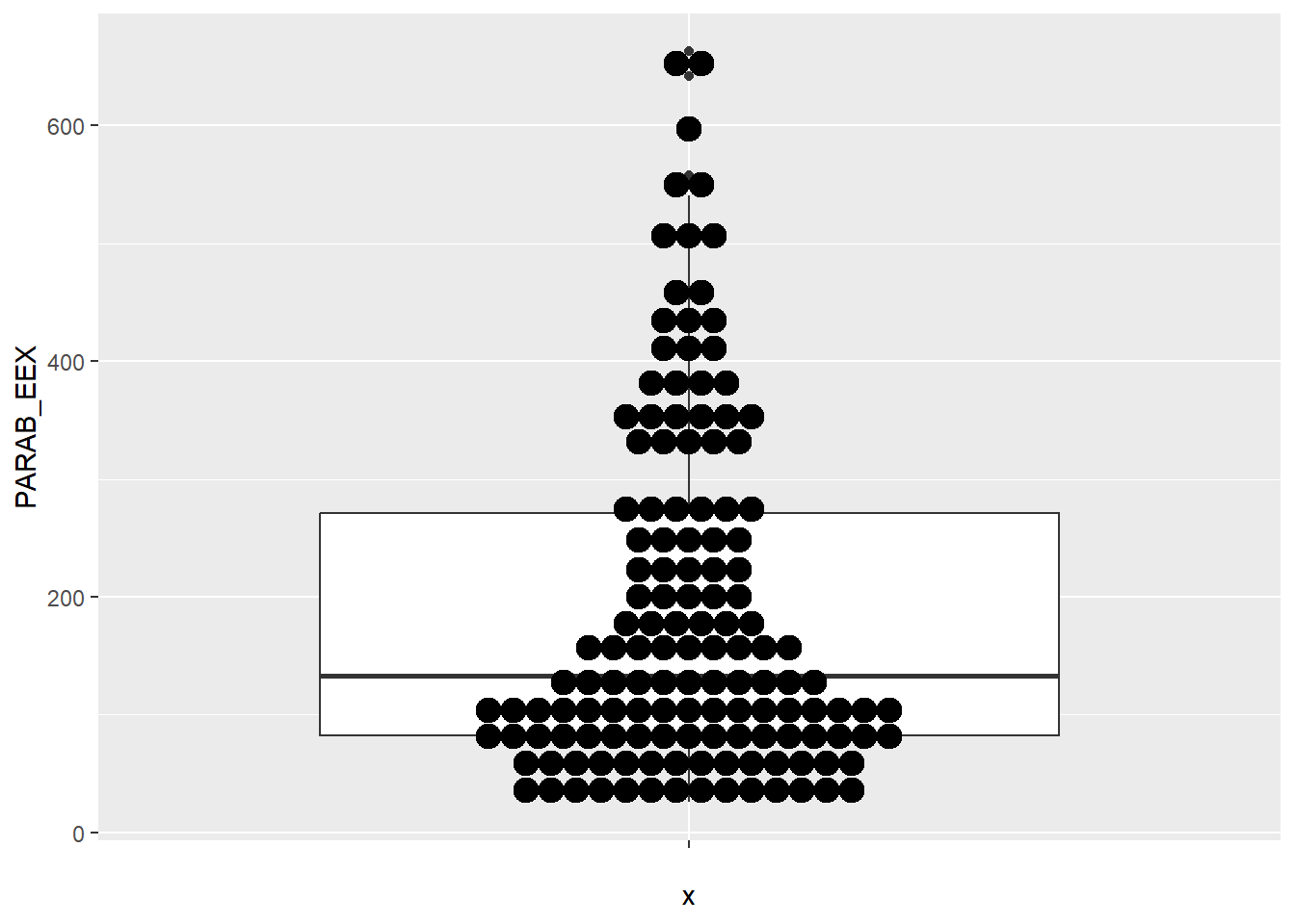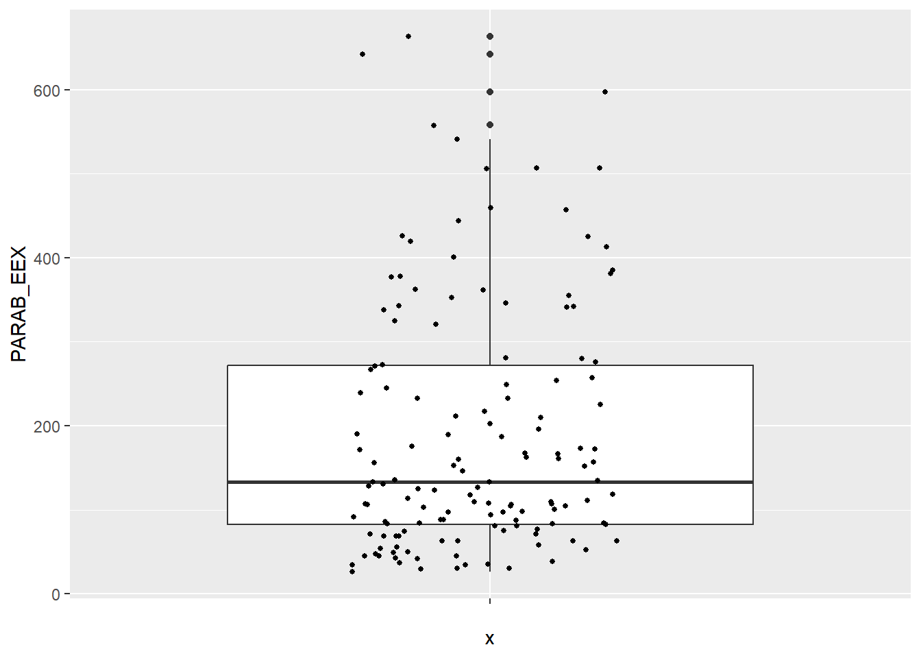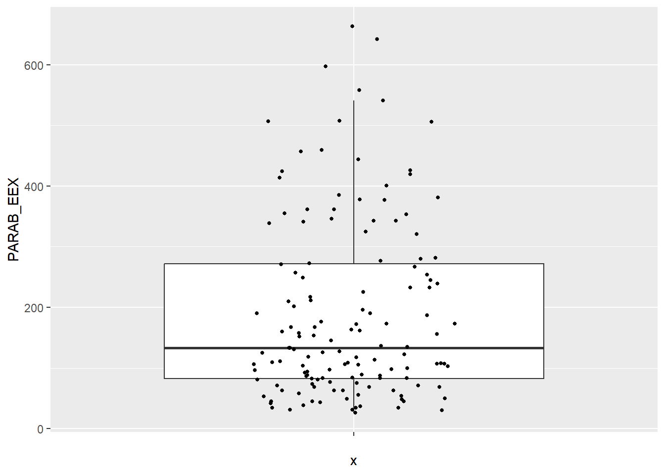 ParabEEXbox + geom_boxplot(outlier.shape = NA) + geom_jitter(shape=16, size=1,position=position_jitter(0.2))