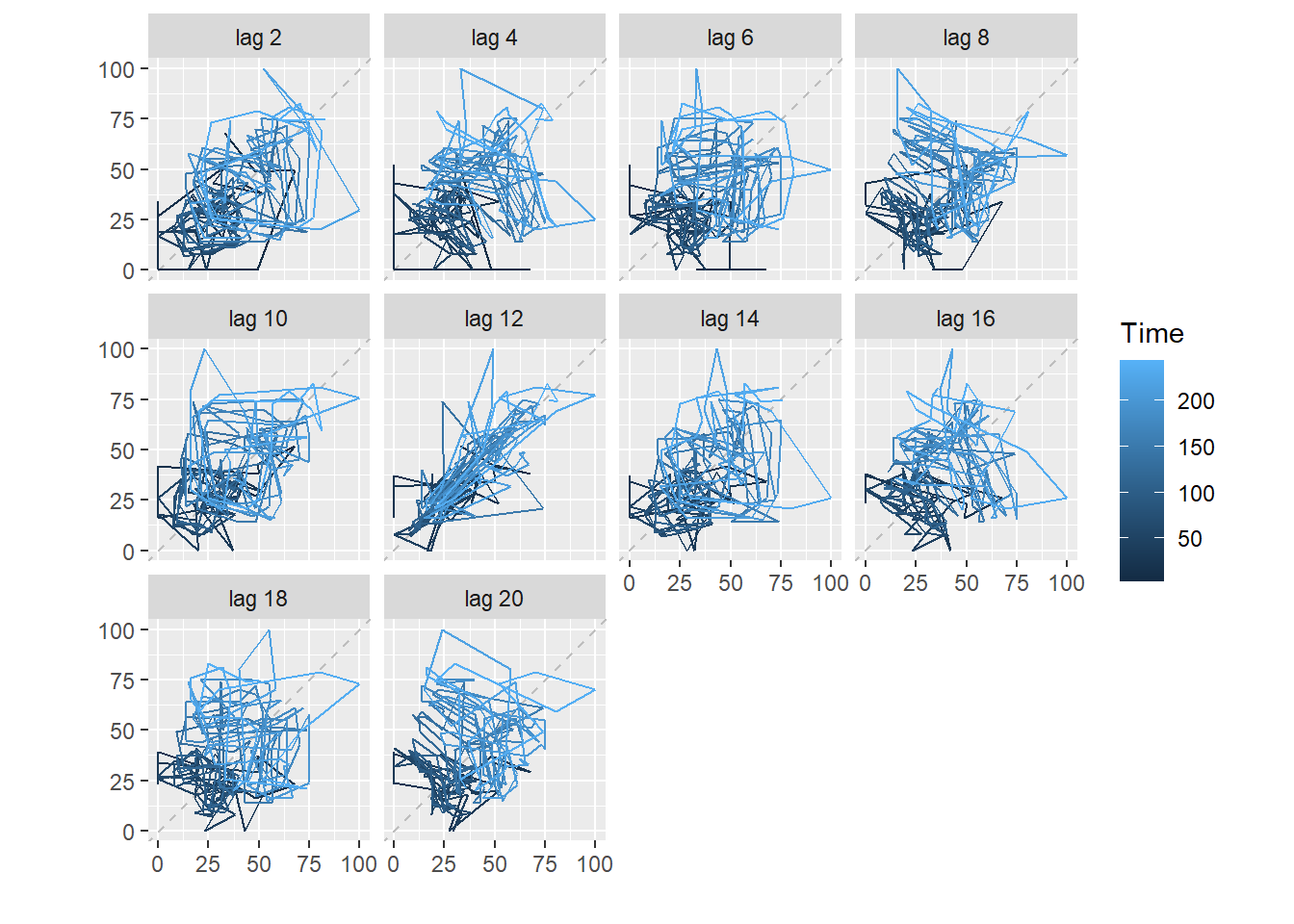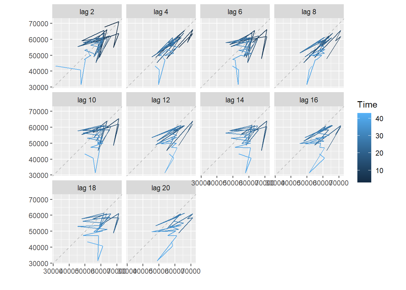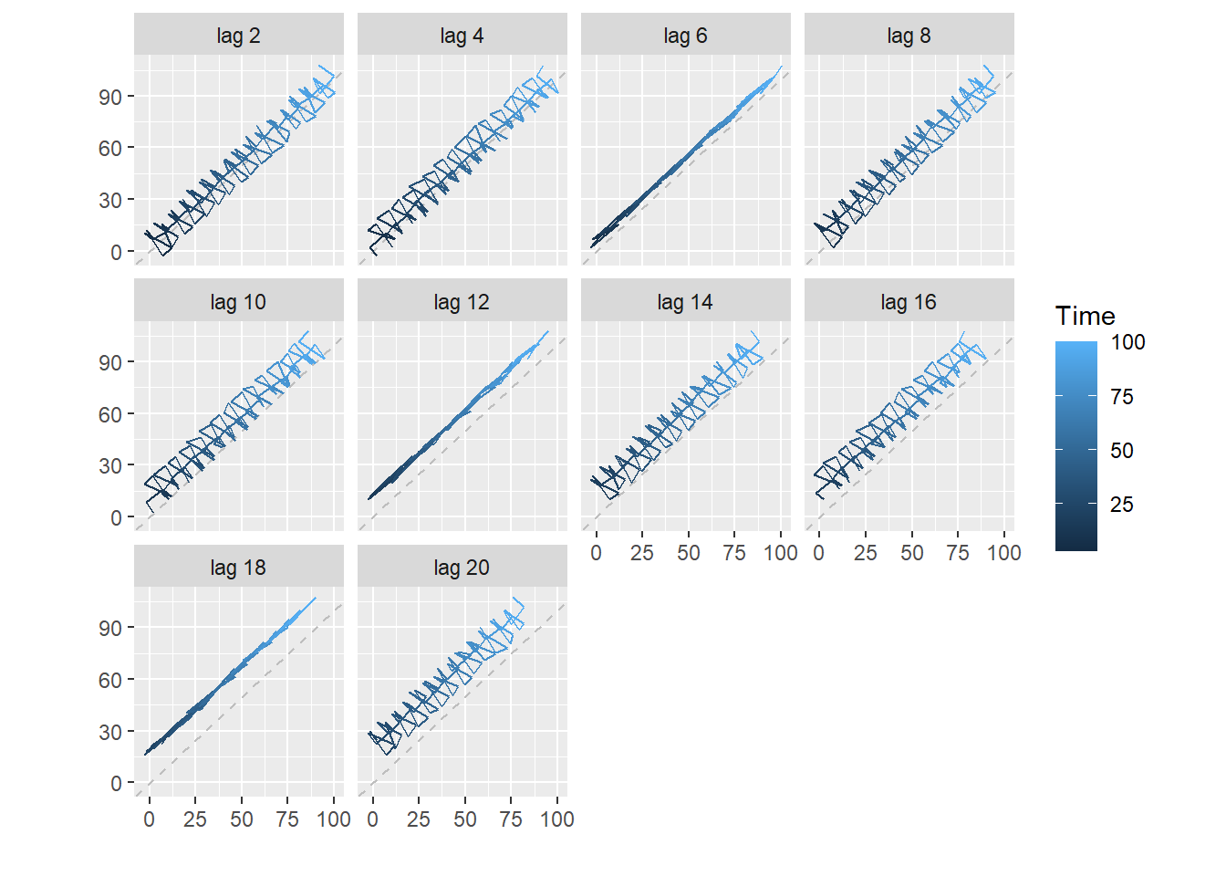 gglagplot(y, continuous = TRUE, set.lags = 2*(1:10))