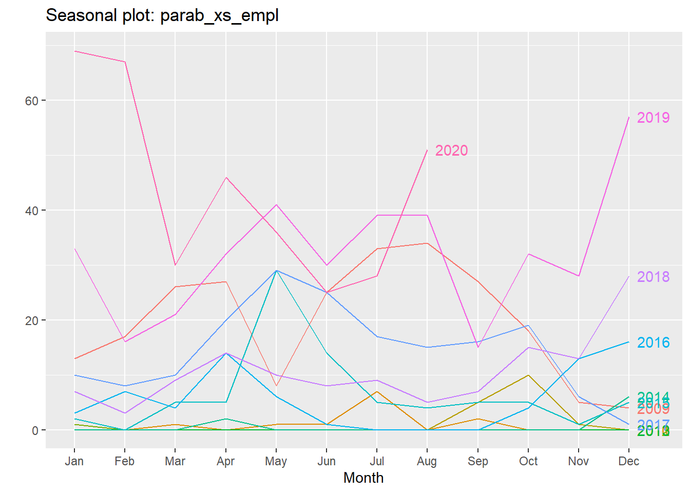 ggseasonplot(parab_xs_empl, continuous=TRUE)
