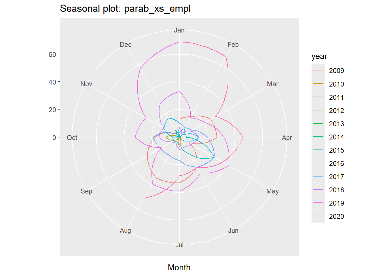 ggseasonplot(parab_xs_empl, polar = T)