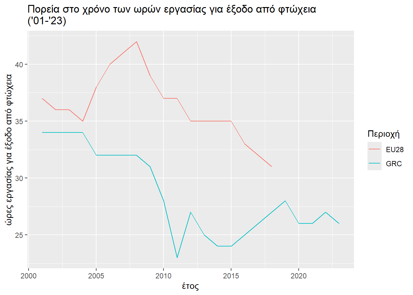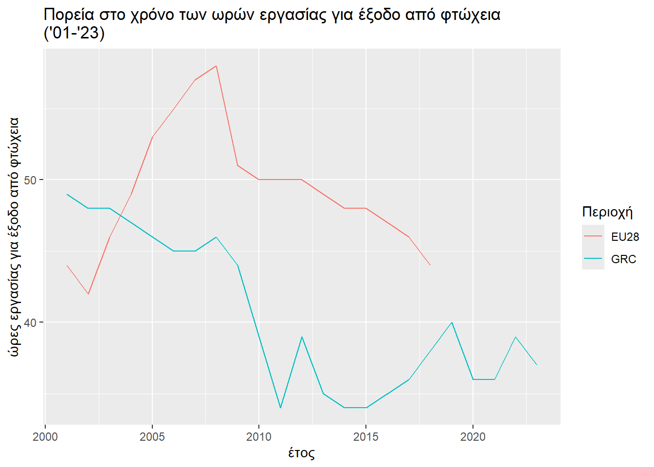 Ας δούμε πρώτα την περίπτωση που ένα ζευγάρι έχει 2 παιδιά. Όσον αφορά την περίπτωση της Ελλάδας και της Ε.Ε., φαίνεται ν’ ακολουθούν μια σταθερή μετά από μια πτωτική πορεία οι ώρες εργασίας που απαιτούνται για την έξοδο από την κατάσταση της φτώχειας. Είναι αυτό σημάδι επικείμενης ανόδου, καθόσον πλησίον ενός ελαχίστου οι μεταβολές είναι ανεπαίσθητες; Θέλουμε μελλοντικά δοδομένα γι’ αυτό. Είναι μήπως η πτωτική πορεία τμήμα ενός ευρύτερου σκαμπανεβάσματος; Θέλουμε παλαιότερα δεδομένα γι’ αυτό.
