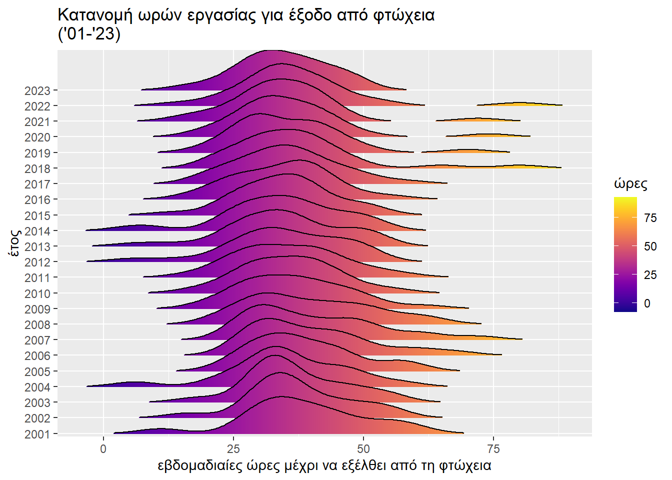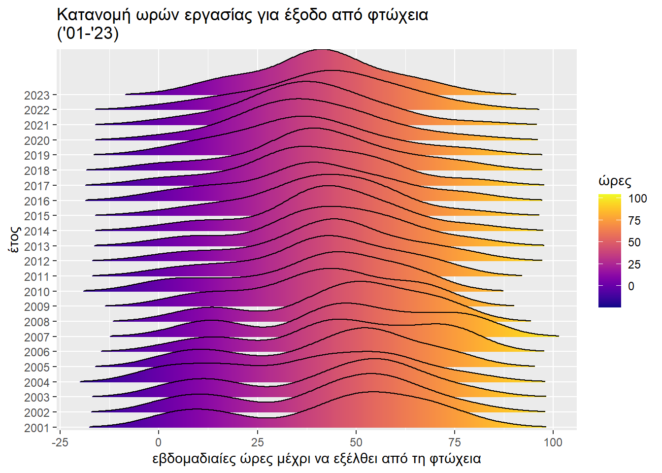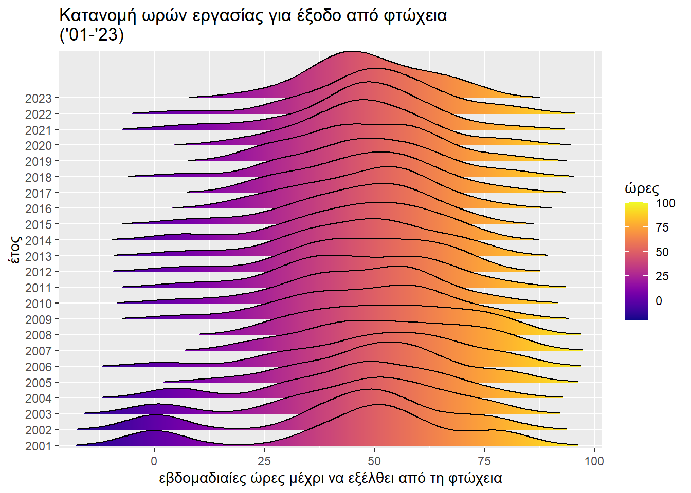 Και πάλι κάνουμε μια οπτική παρουσίαση της εξέλιξης της επίδρασης του παράγοντα «έχω δύο παιδιά ή καθόλου» στη δυσκολία εξόδου από τη φτώχεια.