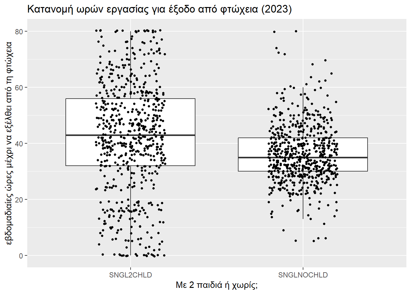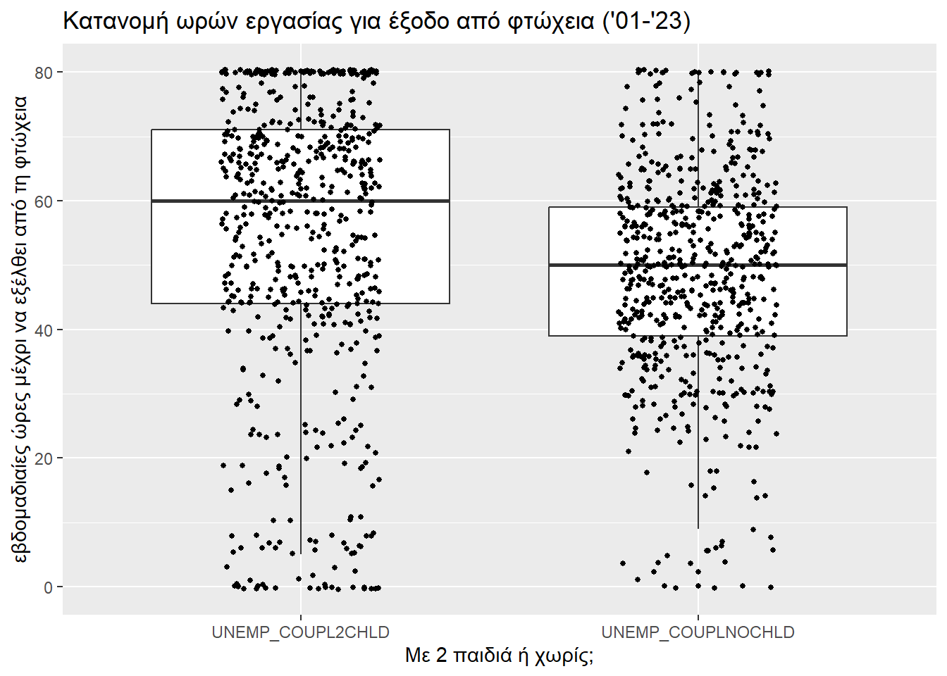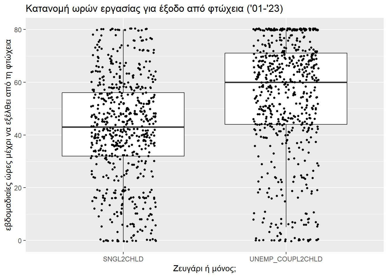 Το r του Wilcoxon (0.2285096) πάλι διλώνει μικρό προς μεσαίο μέγεθος επίδρασης της ύπαρξης παιδιών στη δυσκολία εξόδου από τη φτώχεια. Βέβαια, είναι σαφώς μεγαλύτερο από την περίπτωση που μελετούσαμε ζευγάρια, κάτι που αντικατοπτρίζει και τις δυσκολίες που αντιμετωπίζει μια μονογονεϊκή οικογένεια.